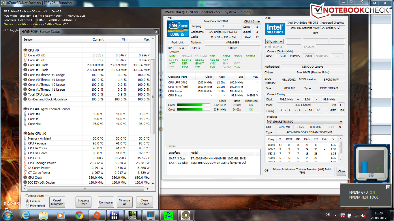 Ein weiterer Punkt in diesem Kontext ist das Thema Throttling: Kann die volle Leistung unter Last abgerufen werden oder gibt es Probleme mit der Hitzeentwicklung? Für die Überprüfung haben wir unseren Stresstest (Furmark + Prime 95) für rund eine Stunde laufen lassen. Die CPU erreicht in diesem Szenario bis zu 98 Grad Celsius, wobei noch keine thermische begründete Abschaltung stattgefunden hat. Die Taktrate der CPU pendelt sich aber bei 2,4 GHz bei zwei aktiven Kernen ein. Bei der anschließenden Ausführung von CineBench R11.5 und 3DMark 06 wurde der Turbo Boost aber wieder normal angesprochen. Im Gaming-Betrieb unter Battlefield 3 konnten wir diesen Fehler reproduzieren. Die CPU arbeitet schon nach kurzer Laufzeit nur noch mit 2,4 beziehungsweise 2,5 GHz Basistakt. Diese Tatsache spricht für eine Begrenzung im BIOS, die von Lenovo vorgenommen wurde. Ein ähnliches Problem hatte auch das Dell XPS 14 Ultrabook. Dort wurde mit einem BIOS-Update geholfen.