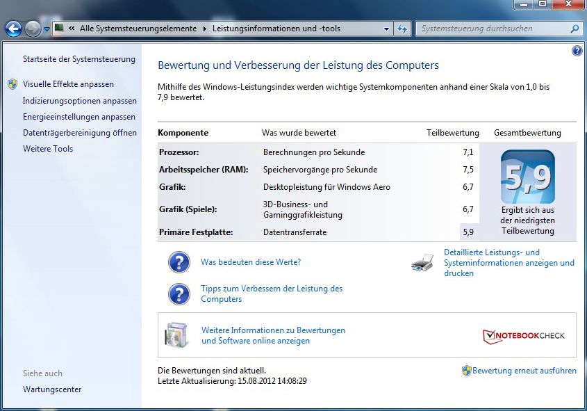 Die Leistung der Komponenten im Ganzen ist ebenfalls ein wichtiger Faktor. Die Systembenchmarks von Futuremark bieten dafür einen guten Anhaltspunkt. Im PCMark 7 erreicht das Z580 eine Gesamtwertung von 2079 Punkten. Auch damit platziert sich das Notebook im breiten Mittelfeld unserer Datenbank, wobei die herkömmliche Festplatte eine höhere Wertung verhindert. Die kurzen Zugriffszeiten eines Solid State Drives und dessen Übertragungsraten heben die Wertung in den meisten Fällen deutlich an. So erreicht beispielsweise das Dell XPS 14 mit gleicher Grafikeinheit 3467 Punkte und sichert sich einen Vorsprung von 67 Prozent. Im Alltag hinterlässt die Leistung des Testgerätes einen meist positiven Eindruck. Der Fensteraufbau geschieht rasch, und allzu lange Ladezeiten gibt es nicht. Im direkten Vergleich mit einem SSD-Notebook wird der Unterschied aber schnell deutlich. Das IdeaPad braucht im Schnitt rund 40 Sekunden zum Hochfahren und noch mal rund 30 bis 50 Sekunden, bis alle Programme geladen sind. Weniger Apps im Autostart zahlen sich hier noch aus.