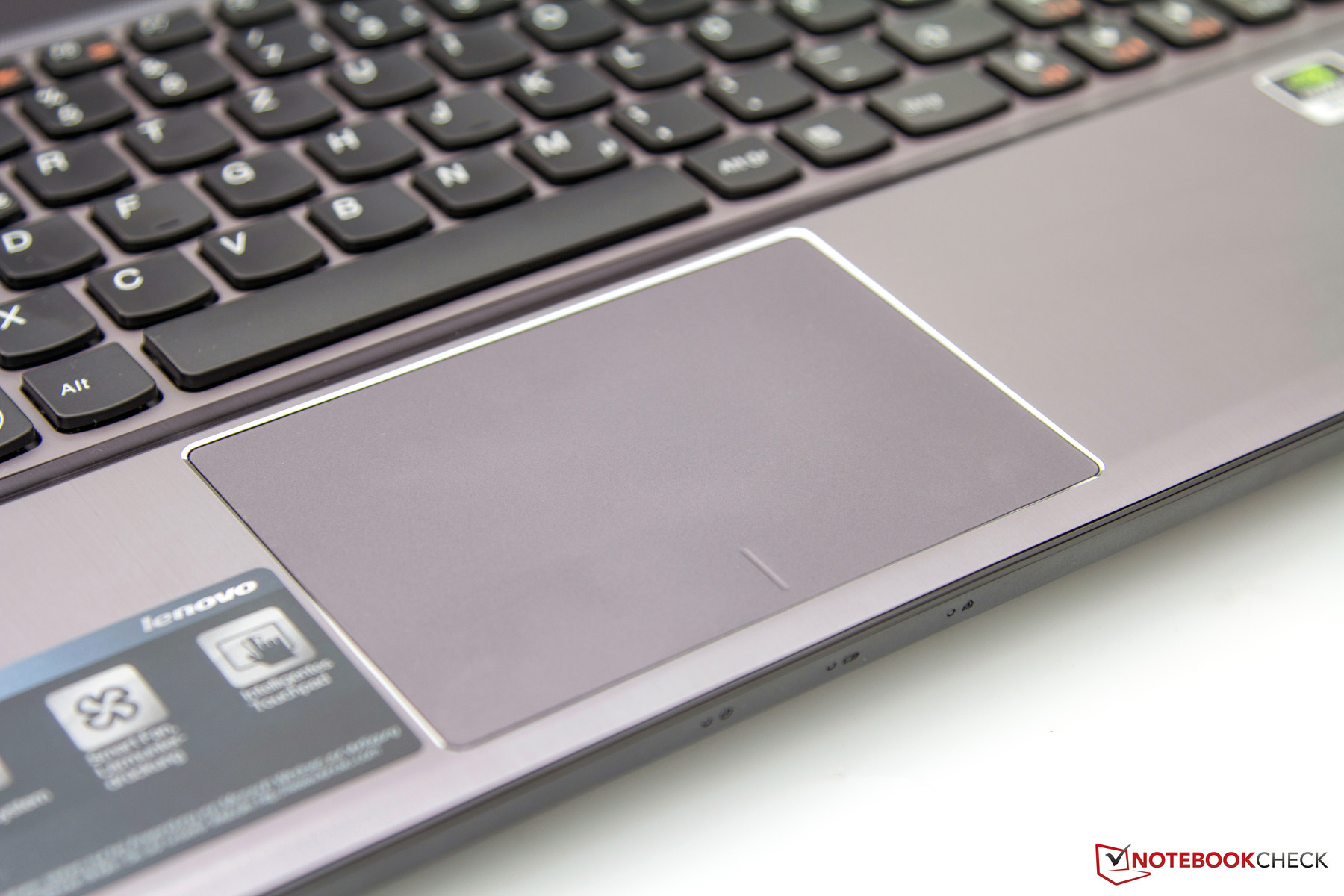 Das Touchpad unterscheidet sich nicht vom Y580. Es ist leicht dezentral angebracht und ausreichend groß dimensioniert. Die etwas matte Oberfläche aus Kunststoff bietet ein gutes Gefühl, wobei die Gleiteigenschaften nicht perfekt sind. Weitere Informationen zu den Eingabegeräten finden Sie im Testbericht des Gaming-Notebooks Lenovo IdeaPad Y580.