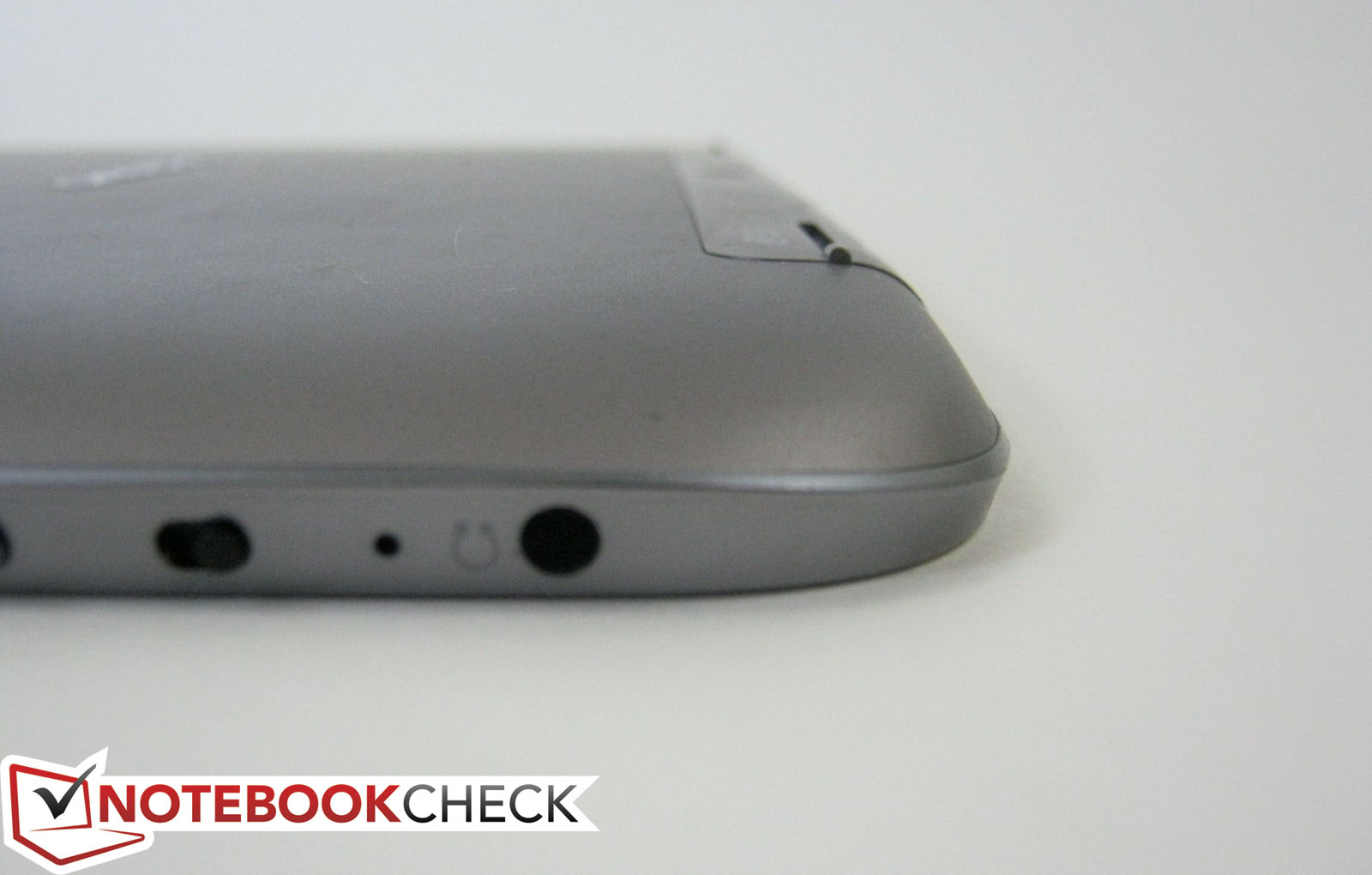 Der Sicherheitsrahmen fordert allerdings auch seinen Tribut: Das A2109A ist mit 11,65 mm dicker als das Nexus 7, Acer Iconia Tab A700, Samsung Galaxy Tab 2 und das Asus Transformer Prime. Der Unterschied ist zwar nicht störend, aber doch spürbar - zumindest wenn man die Tablets direkt miteinander vergleicht. Der sehr elegant aussehende Metallrücken lässt sich schon mit relativ geringem Druck in der Mitte ein wenig eindellen. Der Micro-SD-Kartenleser hat eine kleine Abdeckung, die vor dem Gebrauch entfernt werden muss und sehr filigran wirkt. Glücklicherweise haben diese zwei Unzulänglichkeiten nicht wirklich einen negativen Einfluss auf die Qualiät des Gehäuses.