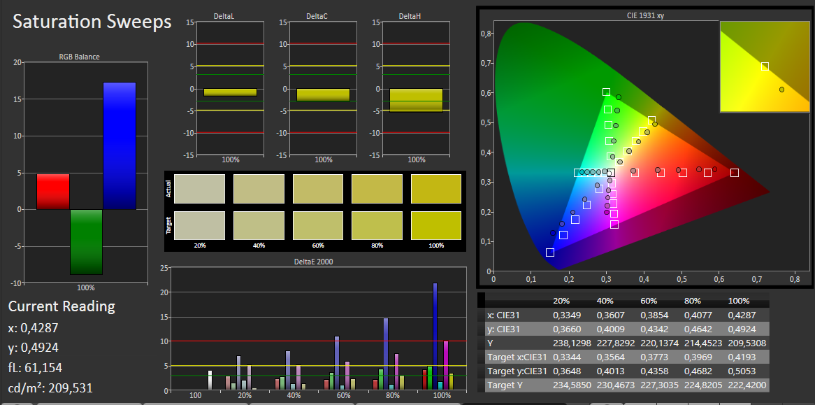 Die Farbgenauigkeit des Displays ist gut. Lediglich bei Blautönen kann es zu einer für das menschliche Auge sichtbaren Farbabweichung kommen. Diesen positiven Eindruck unterstützt der durchschnittliche DeltaE-Wert von 3,7. Der positive Eindruck setzt sich bei den Graustufen fort, die sogar noch etwas besser dargestellt werden (durchschnittlicher DeltaE 3,2) und keinerlei Ausreißer verzeichnen. Bei der Farbsättigung fällt wieder Blau negativ auf (DeltaE 22) und auch Magenta ist mit einem DeltaE von 10 unauffällig.