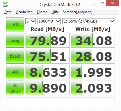 Die Benchmark-Programme PCMark 7 (1.421 Punkte) und PCMark Vantage (2.280 Punkte) bescheinigen dem System eine recht ordentliche Performance. Durch den schnellen Flashspeicher wird das Ergebnis jedoch beschönigt. Zwar ist dieser nicht annährend so schnell wie eine moderne SSD, doch die Zugriffszeiten sind erheblich kürzer als bei herkömmlichen Festplatten. Die Ausführung von PCMark 8 funktionierte zwar, beim Finalisieren der Benchmark-Resultate stürzte das Programm jedoch ab.