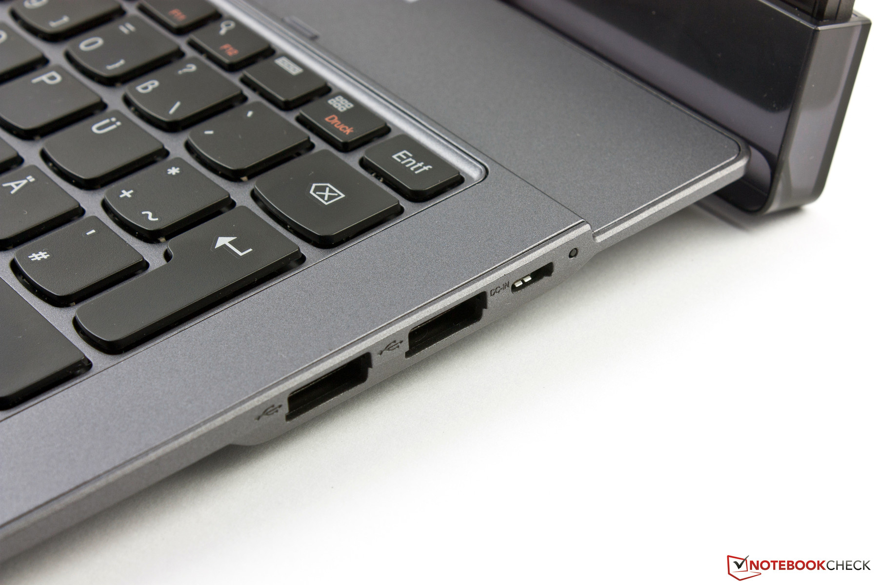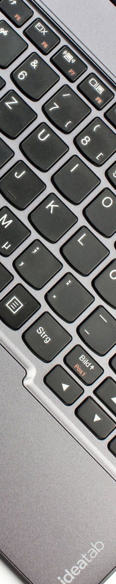 Das physikalische Eingabegerät im Dock wirkt mit seinen 84 Tasten etwas auf die kleine Fläche gequetscht. Vor allem die Enter-, Backspace- und Left-Shift-Taste hätten größer ausfallen dürfen. Die QWERTZ-Tasten haben ein Maß von 15 x 15 mm und liegen angenehme 3 mm weit auseinander. Alle Tasten sind flach. Der Hub ist etwas zu weich und das Klicken sehr leise. An dieser Stelle hätten wir uns mehr Feedback von der Tastatur gewünscht. Das Tastaturbett drückt sich bei jedem Tastenanschlag sichtbar ein. Eine Hintergrundbeleuchtung gibt es nicht.