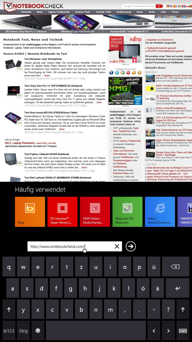 Die virtuellen Tastaturen sind in Windows 8 großzügig gestaltet. Wer das Tablet lieber in zwei Händen hält, wird seine Freude an der Split-Tastatur haben. Jedoch nehmen beide Varianten viel Platz auf dem Screen ein. Im Hochformat sind die Tasten immer noch groß genug und es bleibt ein ausreichend großer Bereich sichtbar.