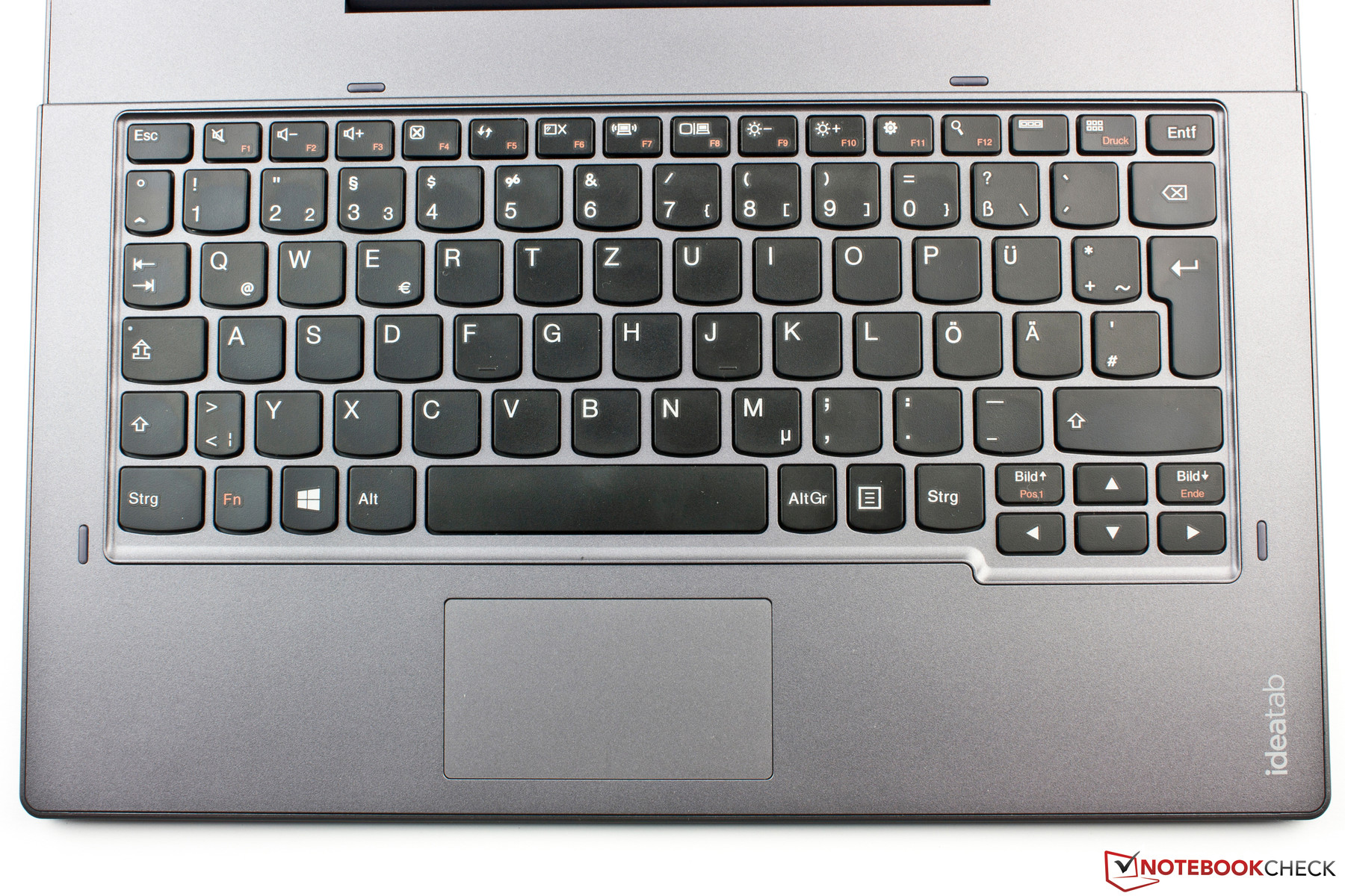 Die komplette obere Reihe ist mit Windows-Funktionstasten gespickt. Um eine F-Taste nutzen zu können, muss mit der Fn-Taste gearbeitet werden.