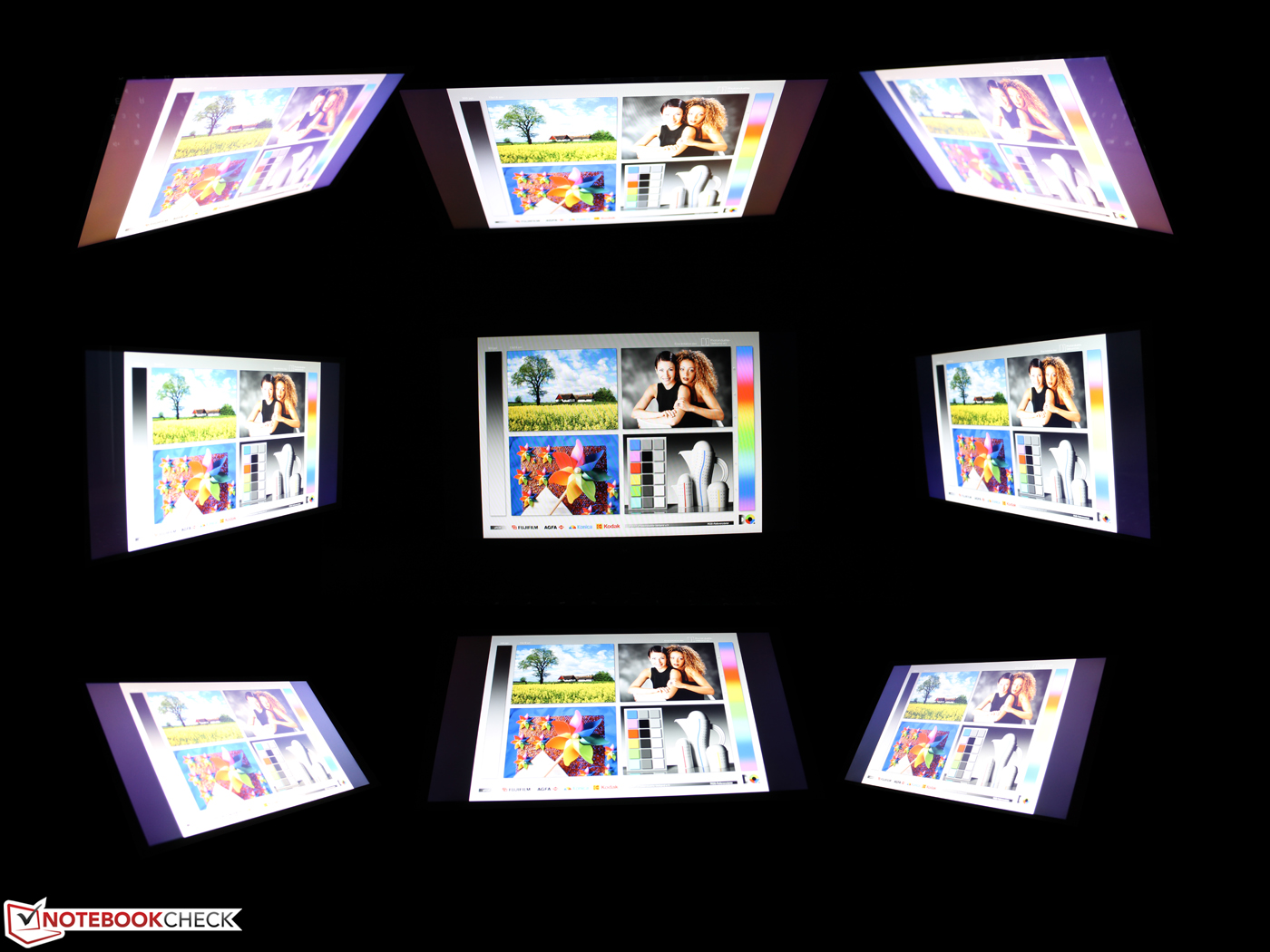 Die Blickwinkel des Panels entsprechen denen einer guten IPS-Anzeige (In Plane Switching). Vertikal und horizontal erlaubt es weite Abweichungen von der zentralen Sichtposition. Wir können von 85 Grad seitlich oder von oben/unten in die Anzeige schauen und erleben weder Geisterbilder noch ein ungewünschtes Abdunkeln. Das Blickwinkel-Bild irritiert auf Grund der hohen Helligkeit in dieser Hinsicht (Überblendung), weite Blickwinkel sind aber vorhanden.