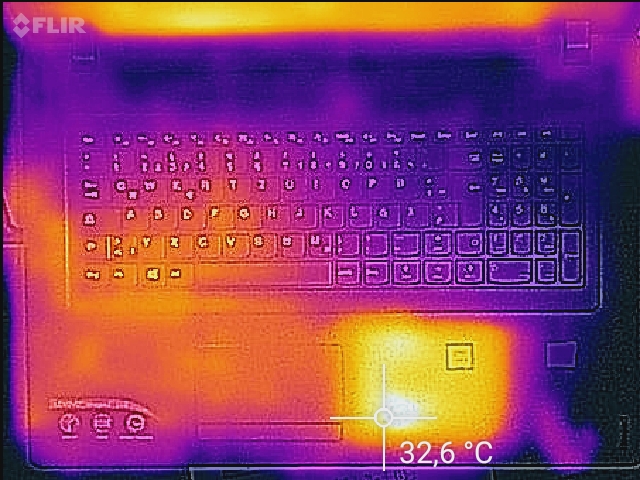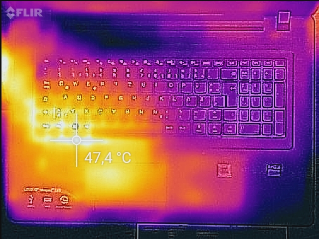 Unseren Stresstest (Prime95 und Furmark laufen für mindestens eine Stunde) durchläuft das Ideapad im Netz- und im Akkubetrieb auf leicht unterschiedliche Weisen. Der Prozessor arbeitet immer mit 2,4 bis 2,5 GHz. Der Grafikkern geht mit 400 MHz (Akkubetrieb) bzw. 955 MHz (Netzbetrieb) zu Werke. Die Erwärmung des Rechners hält sich in Grenzen. Während des Stresstests wird nur an wenigen Messpunkten die Vierzig-Grad-Celsius-Marke überschritten. Im Alltagsbetrieb fallen die Temperaturen deutlich niedriger aus.