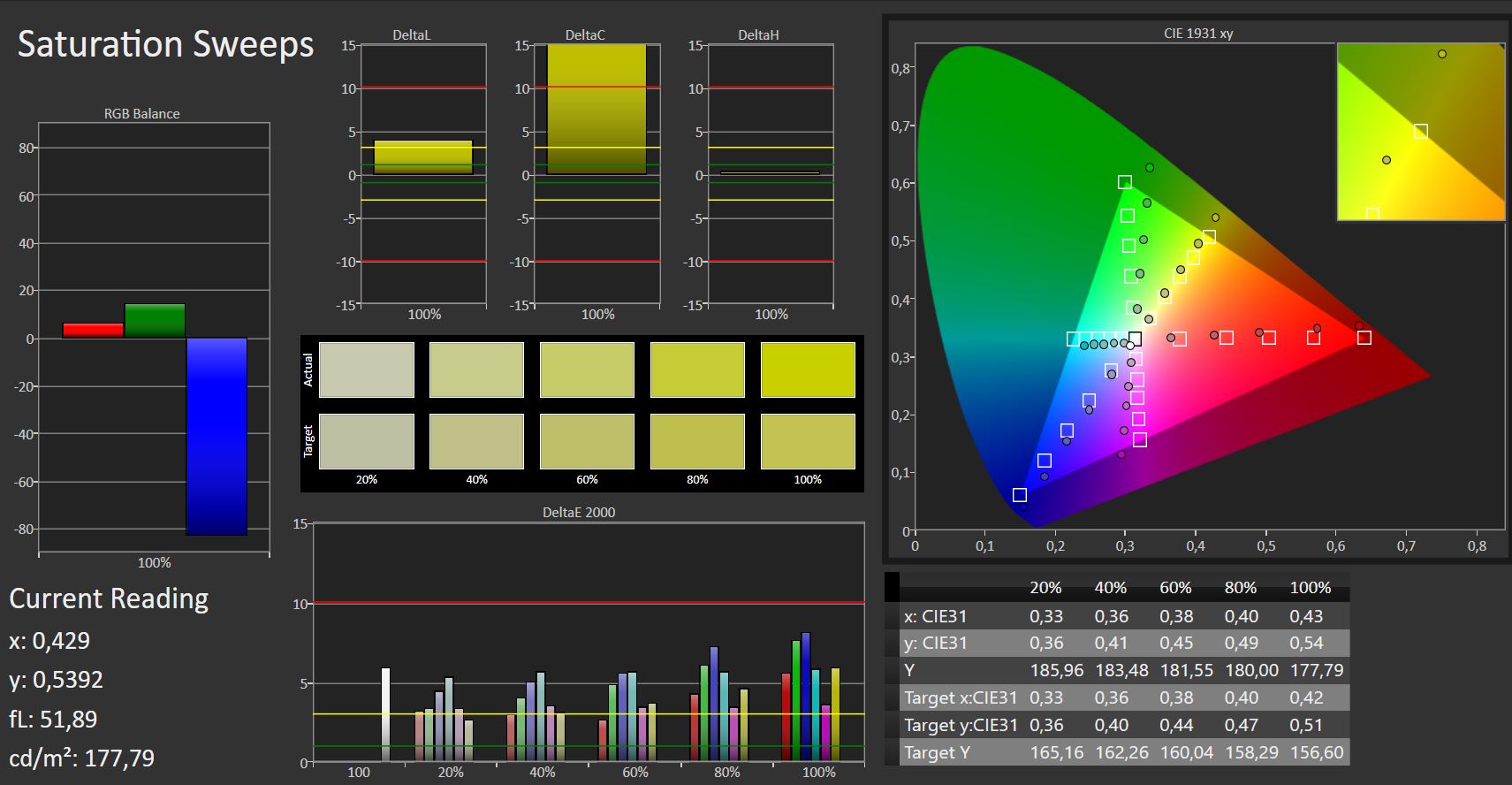 | Delta E Graustufen * | 3.36 | 5.5 -64% | 3.12 7% | 5.93 -76% | 2.41 28% | 3.23 4% |