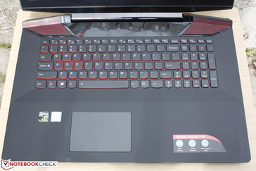 Wir sind nach wie vor über die fehlenden Zusatz- oder Makrotasten enttäuscht. Diesen Punkt haben wir bereits beim Y700 15ISK bemängelt, aufgrund des zusätzlichen Platzes ist die Entscheidung aber noch unverständlicher. Nichtsdestotrotz begrüßen wir die normal großen Pfeiltasten, ganz im Gegensatz zu dem Envy 17 oder Acer Aspire Nitro VN7.
