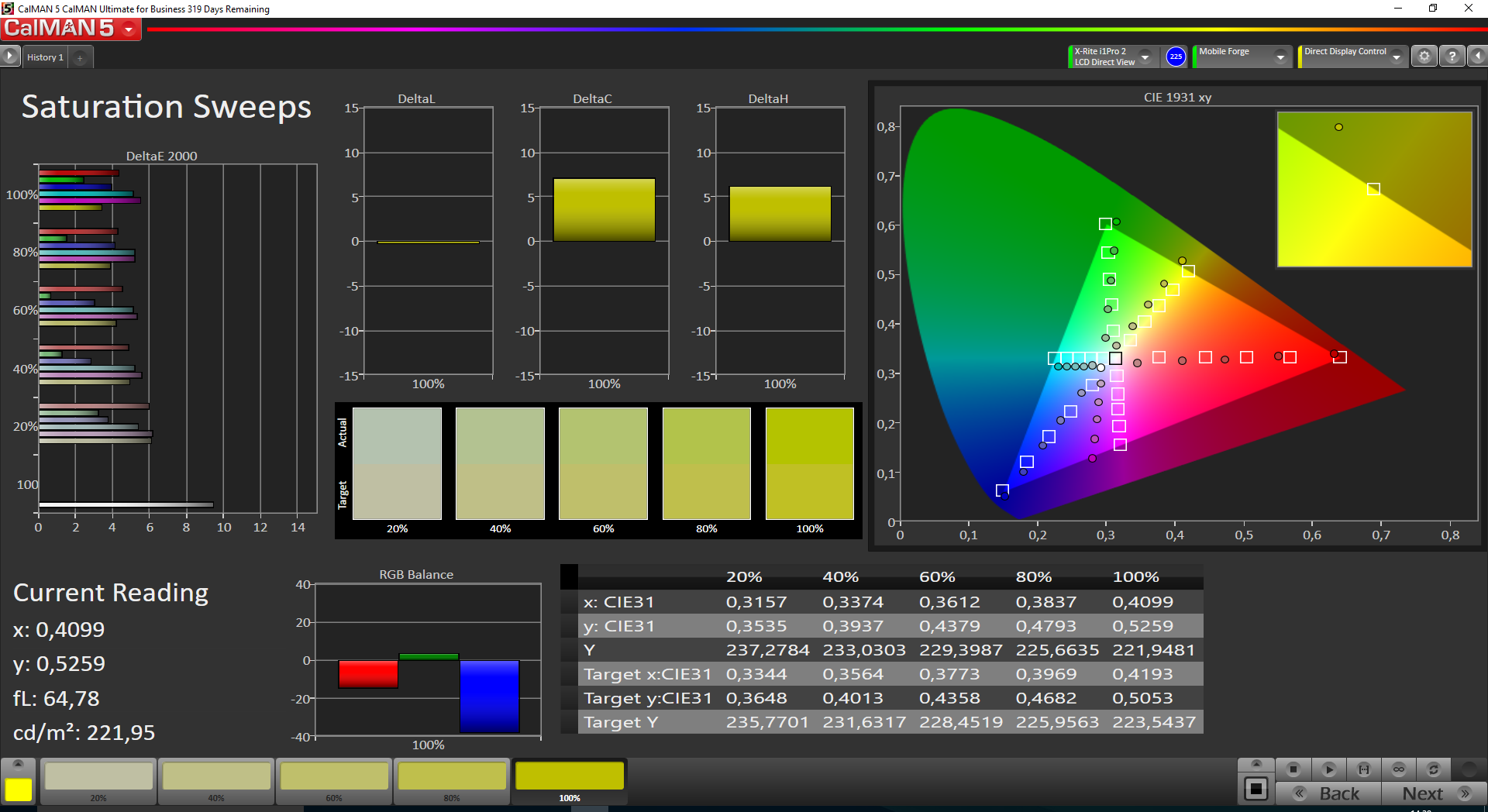 | Brightness (cd/m²) | 461 | 291 -37% | 521 13% | 345 -25% | 355 -23% | 386 -16% |