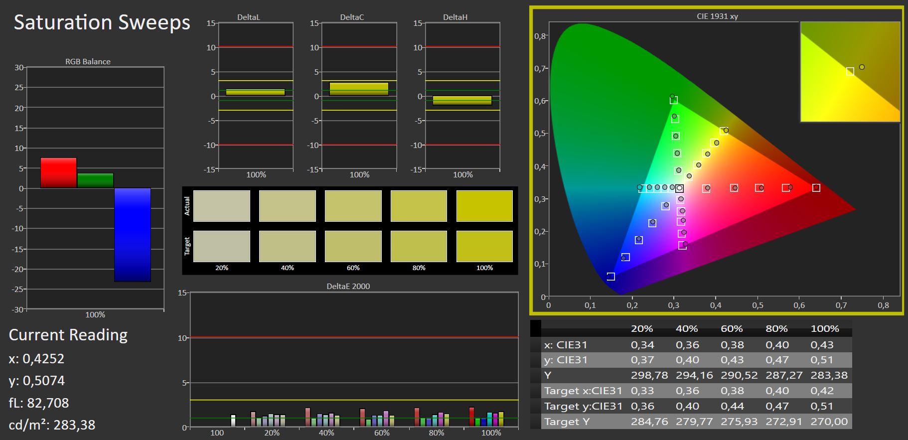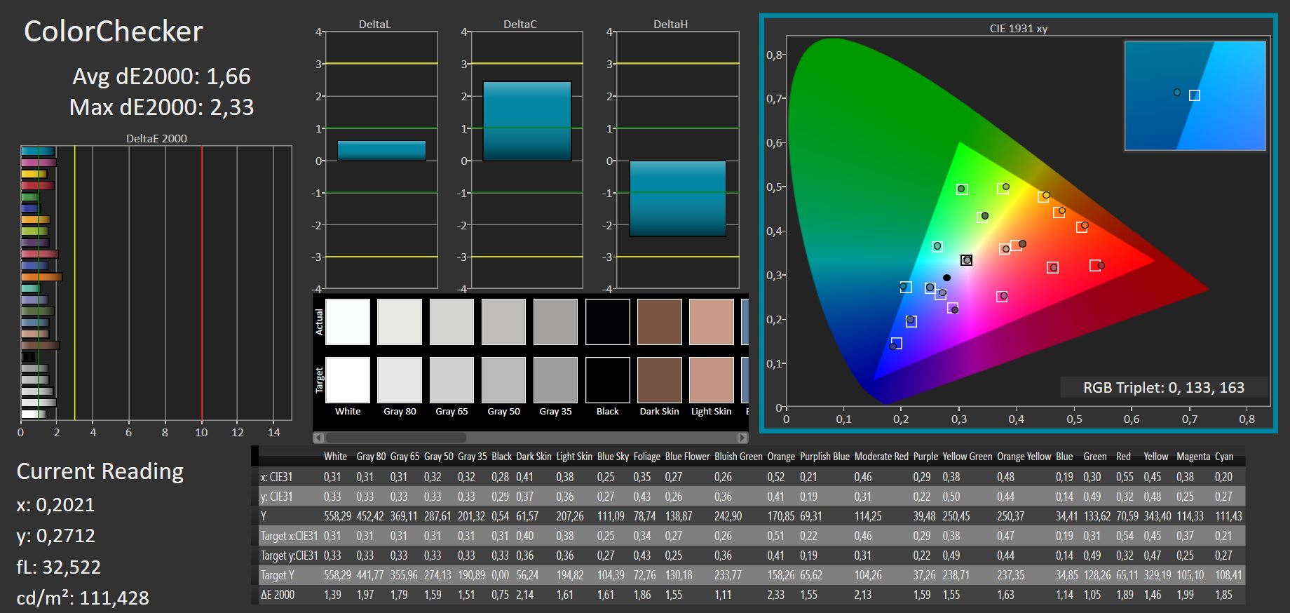 | Colorchecker dE 2000 calibrated * | 1.66 | 0.7 58% | 0.82 51% | 1.13 32% | 1.28 23% | |
