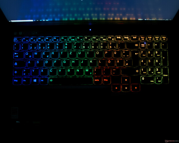 Der Legion-5-Pro-Gaming-Laptop ist mit einer RGB-beleuchteten Inseltastatur ausgestattet. Der Tastenhub von etwas mehr als einem Millimeter ist recht angenehm. Mit einer Tastengröße von ca. 16 × 15 mm entsprechen die Größenverhältnisse ungefähr einer Standard-Tastatur. Beim Gaming ist das Ansprechverhalten der Tasten gut. Die Hintergrundbeleuchtung der Tastatur hat zwei verschiedene Helligkeitsstufen und vier Bereiche, in denen die Farbe eingestellt werden kann. Die Abgrenzung der einzelnen Bereiche ist eher fließend, sodass an den Übergängen Mischfarben entstehen. Über die Lenovo-Vantage-App lassen sich verschiedene Beleuchtungsmodi und Effekte auswählen.