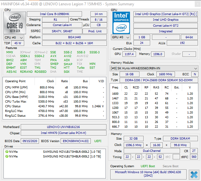 Unser Testgerät ist mit einem Intel Core i9-10980HK mit integrierter UHD Graphics 630 sowie einer dedizierten Nvidia GeForce RTX 2080 Super Max-Q ausgestattet. Mit diesem Gespann gehört unser Legion 7 zu den schnellsten Laptops, die derzeit auf dem Markt erhältlich sind. Alternativ stehen Modelle mit dem Core i7-10750H zur Verfügung. Die Core-i9-Modelle sind mit zwei 16-GB-DDR4-3200-RAM-Modulen und die Core-i7-Modelle mit zwei 8-GB-DDR4-2933-Modulen bestückt. Für derart leistungsfähige Hardware sind natürlich auch alltägliche Aufgaben keine Herausforderung.