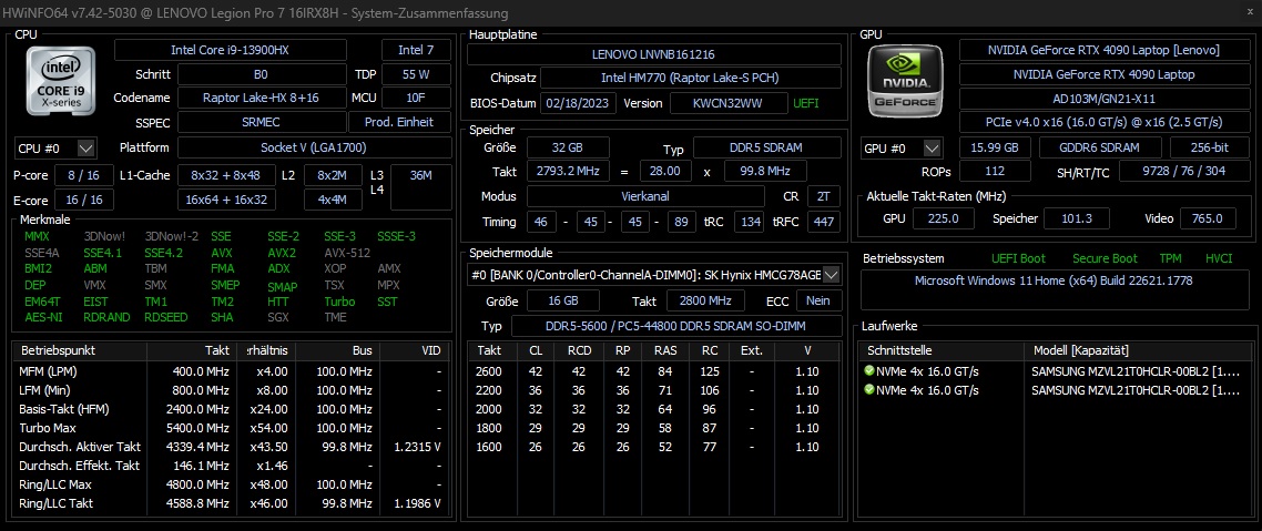 Das vorliegende Legion Pro 7 16IRX8H gehört nicht nur zu den stärksten, sondern auch zu den teuersten Gaming-Notebooks. Mindestens 4.500 Euro muss man aktuell für die Kombination aus Core i9-13900HX, GeForce RTX 4090, 32 GB RAM (2x 16 GB DDR5-5600), 2 TB Massenspeicher (2x 1 TB NVMe-SSD) und 240-Hz-Display (2.560 x 1.600 Pixel) hinblättern. Ob man die derzeitige Preispolitik der Hersteller, welche fernab jeglicher Inflation liegt, mittragen möchte oder nicht, muss jeder Gamer für sich entscheiden.