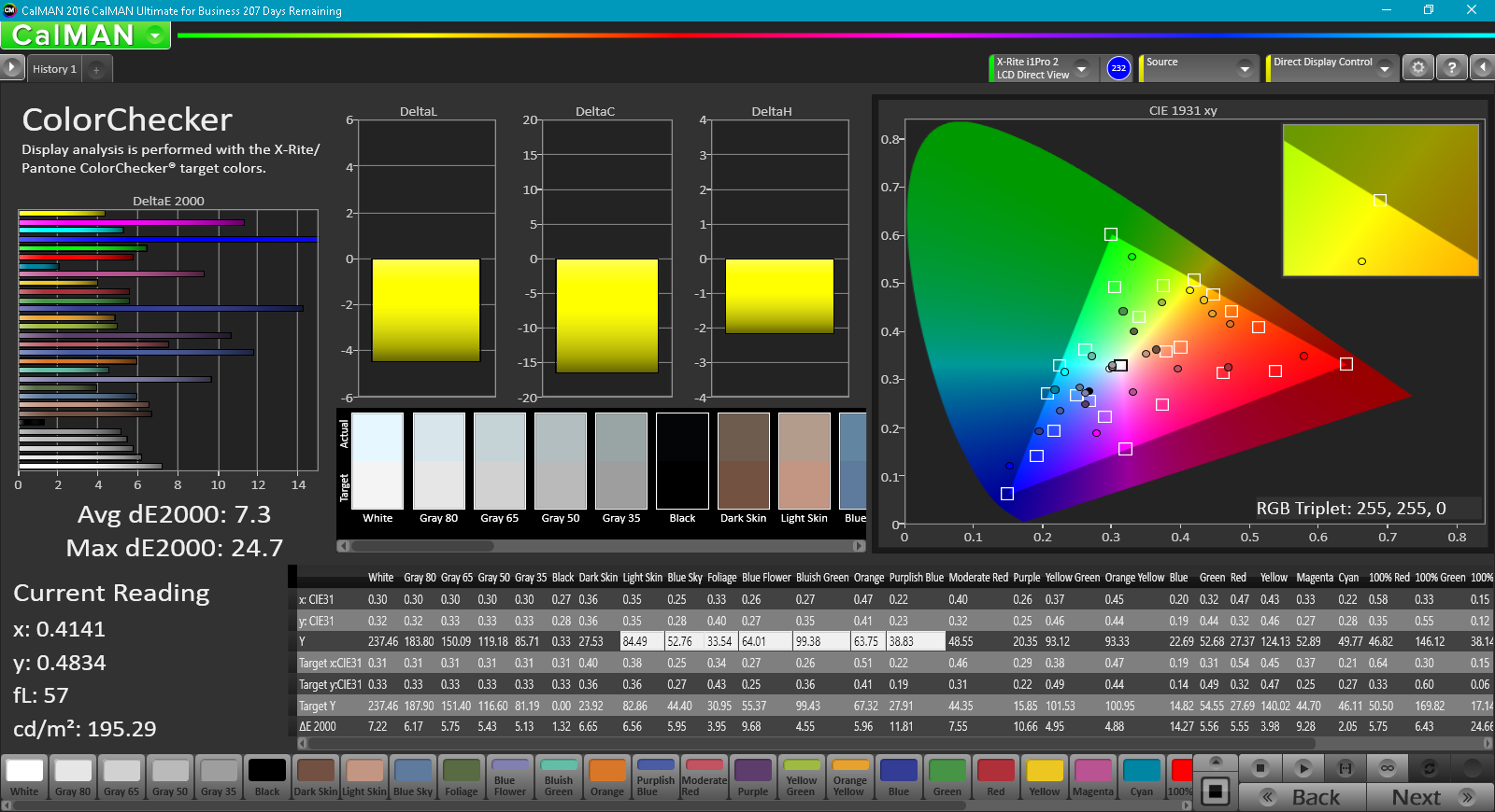 Die CalMAN 5-Ergebnisse sind nicht schlecht, aber auch nicht besonders beeindruckend. Farbtreue ist nicht die Stärke des Displays: ColorChecker und Greyscale DeltaE-Werte liegen jeweils bei 7,3 und 4,9. Der Total Gamma-Wert ist jedoch mit 2,19 fast ideal (Optimaler Wert: 2,4) während der CCT-Durchschnitt mit 7.332 K nicht beeindruckt (Optimaler Wert: 6.500 K). Mithilfe einer Kalibrierung können die Werte deutlich verbessert werden. Die durchschnittlichen ColorChecker /Greyscale DeltaE-Werte sanken auf 5,5/2,0 und der CCT-Durchschnitt erreichte sehr gute 6.580.