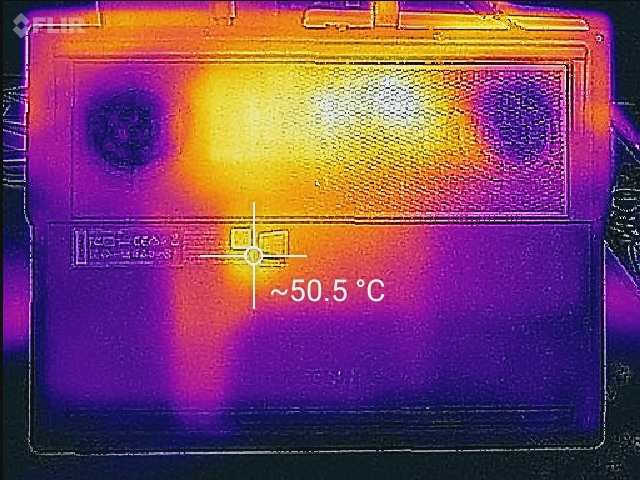 (-) Auf der Unterseite messen wir eine maximalen Wert von 52 °C (im Vergleich zum Durchschnitt von 43.3 °C).