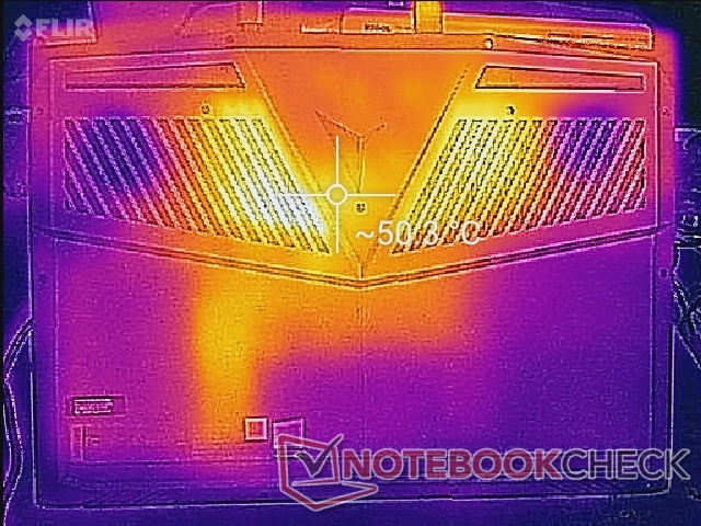 Die Oberflächentemperaturen sind hinten in der Mitte des Systems am höchsten, da der Aufbau der Kühllösung fast symmetrisch ist. Im Leerlauf kommt die warme Stelle in der Mitte auf 30 °C, die Handballenablagen auf 24 bis 26 °C. Erwähnenswert ist es an dieser Stelle, dass die rechte Handballenablage aufgrund der sich direkt darunter befindenden Festplatte und M.2 SSD immer etwas wärmer sein wird. Vor allem die M.2 SSD kann die Unterseite bei hoher Last auf bis zu 47 °C erwärmen.