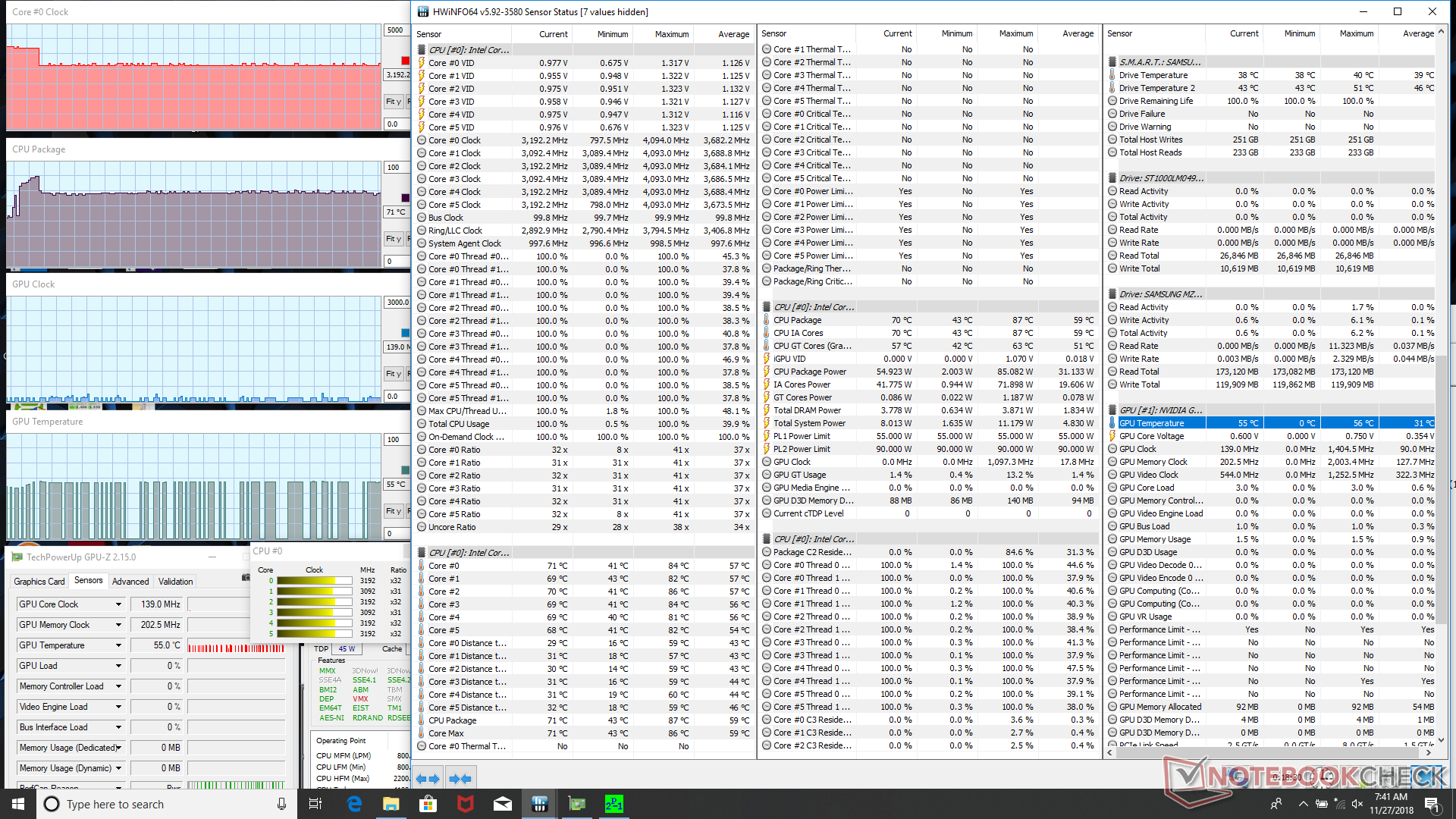 Um potenzielles Drosseln und mögliche Stabilitätsprobleme festzustellen, unterziehen wir das Notebook einem Stresstest. Unter Prime95-Last erreicht der Prozessor in den ersten paar Sekunden eine Taktfrequenz von bis zu 3,9 GHz, wobei er 87 °C erreicht. Nach Erreichen dieses Temperaturlimits sinkt die Taktfrequenz auf 3,1 bzw. 3,2 GHz, um, wie der Screenshot unten zeigt, eine stabile Kerntemperatur von 71 °C zu halten. Lässt man Prime95 und FurMark gleichzeitig laufen, sinkt die Taktfrequenz der CPU auf 2,9 GHz, während die Kerntemperatur auf 83 °C steigt. Die Taktrate der CPU fällt nie unterhalb ihres 2,2-GHz-Basistakts.
