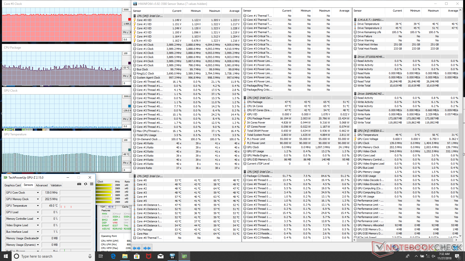 The Witcher 3 laufen zu lassen repräsentiert praktische Gaming-Lasten jedoch besser. Hier beobachten wir jeweils 3,9 GHz und 1696 MHz für die CPU bzw. GPU und gute Kerntemperaturen von minimal 70 °C. Vergleichsweise pendelt sich das MSI GS65 bei der gleichen Gaming-Last mit dem gleichen Prozessor und der gleichen Grafikkarte bei einer etwas wärmeren Temperatur von ~75 °C ein.