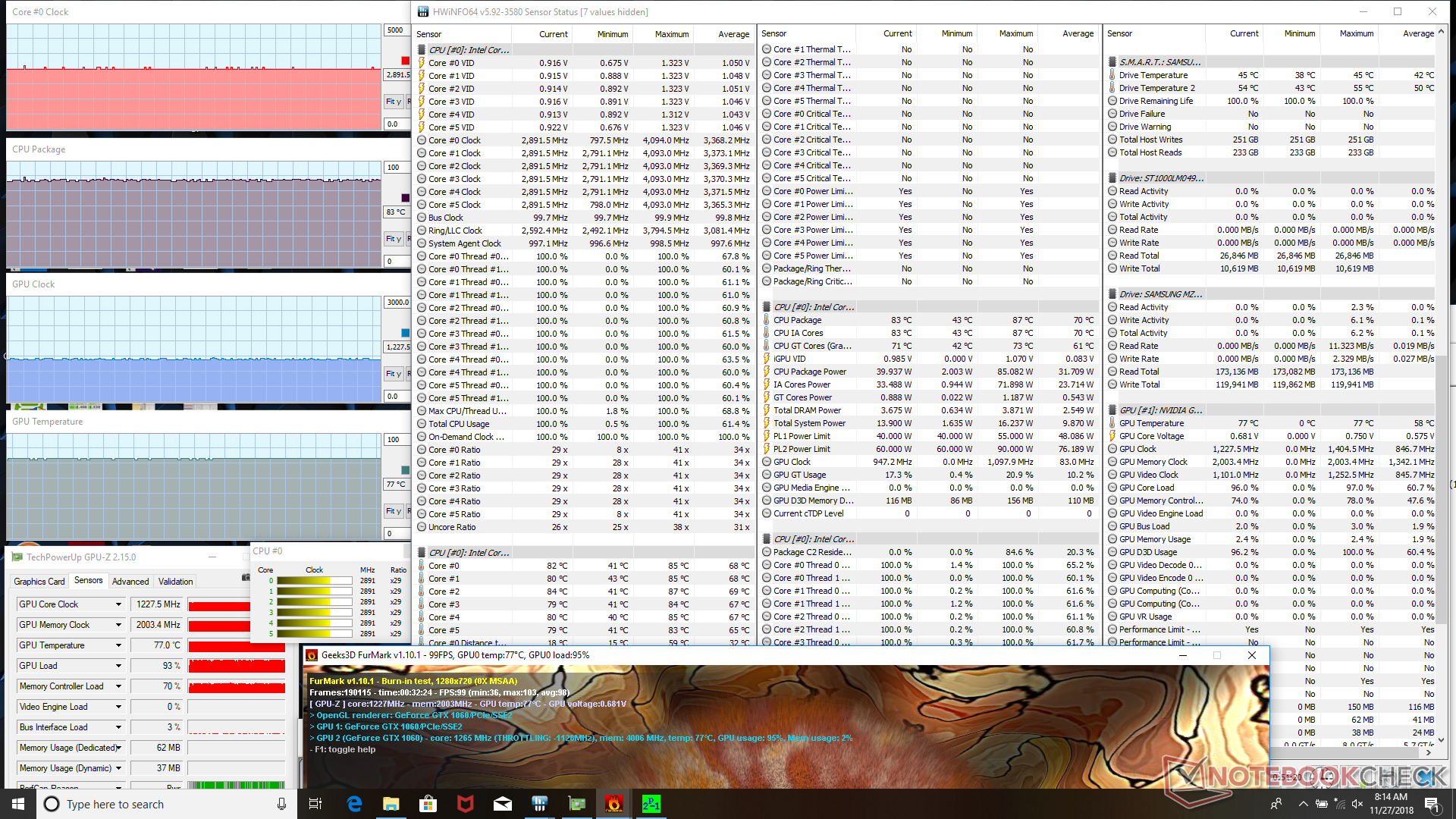 | Prime95 + FurMark Stress | 2.9 | 1228 | 83 | 77 |