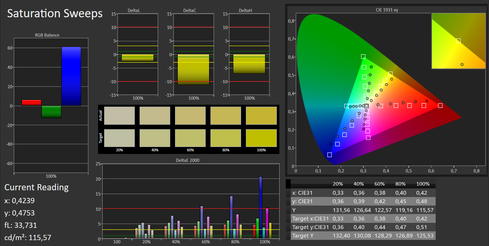 Als nächstes wollen wir einen Blick auf die CalMAN-Analyse werfen. Diese liefert uns delta-E-Abweichungen der Farben und Graustufen um 5. Besonders bei den Graustufen kann eine Kalibrierung Verbesserung verschaffen. Hier fällt die Abweichung auf 0,67.