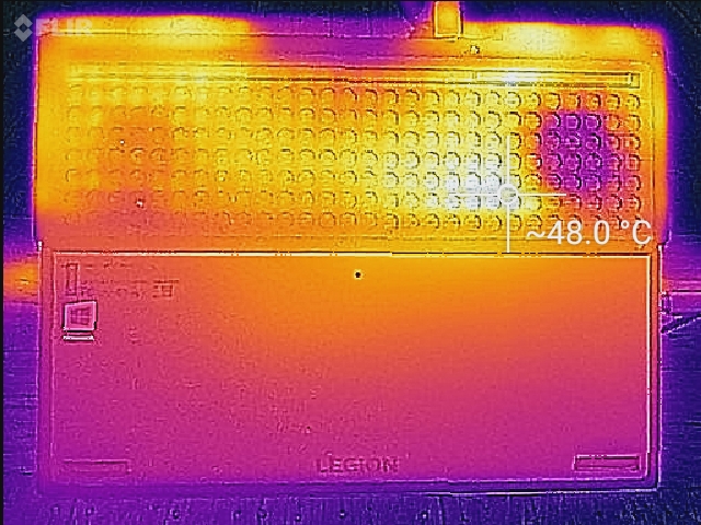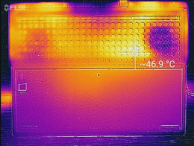 Während das 15-Zoll-Y740 zwar genauso leise ist wie sein 17,3-Zoll-Gegenstück, wird es unter Last doch etwas wärmer. Wir konnten im Tastaturbereich Hotspots von bis zu 37,6 °C messen (oben mittig), während auf der Unterseite bis zu 48 °C erreicht werden. Generell erreicht der rechte und hintere Bereich des Geräts auf der Unterseite im Leerlauf gute 40 °C. Stellen Sie also sicher, dass das Gerät beim Gamen gut durchlüften kann.