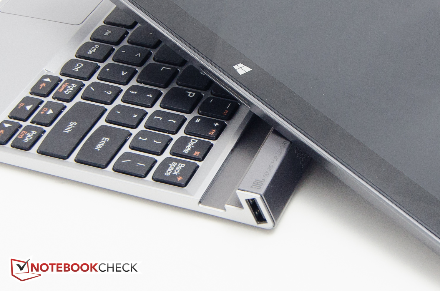 Die Stereolautsprecher von JBL, die sich auf der linken und rechten Seite des Tablets befinden, werden von einem Subwoofer unterstützt, sobald sich das Miix im Tastaturdock befindet. Der Klang ist extrem blechern, wenn man nur das Tablet verwendet. Selbst mit dem Subwoofer könnte der Klang unserer Meinung nach besser sein, auch wenn er die Situation deutlich verbessert. Wir empfehlen definitiv externe Lautsprecher oder Kopfhörer für ein besseres Klangerlebnis, für die Filmwiedergabe oder YouTube-Videos ist die Qualität allerdings ausreichend.