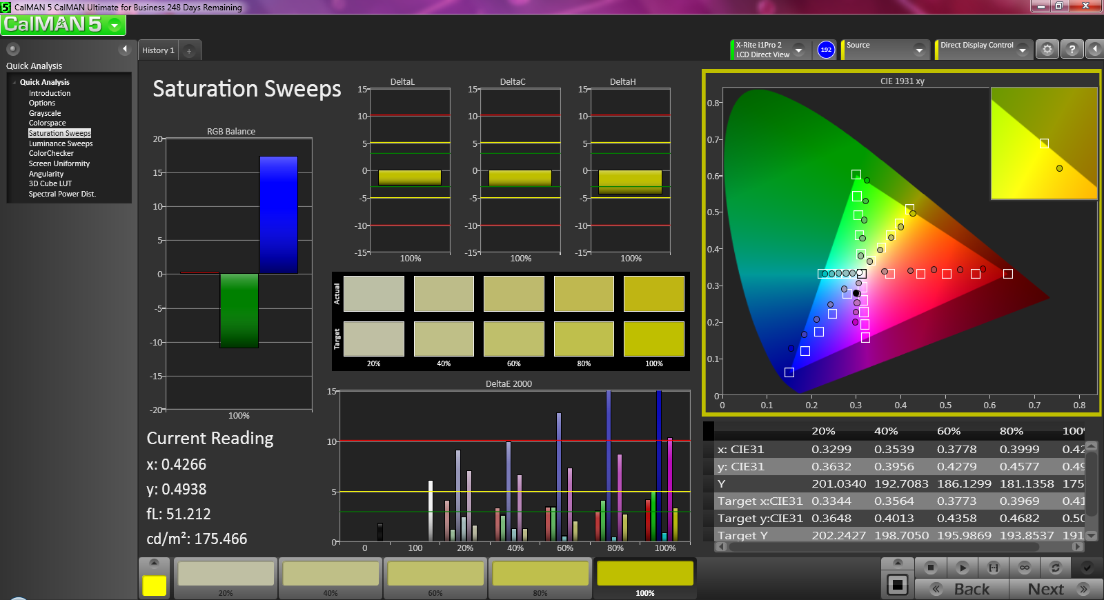 Unsere Analyse mit dem X-rite i1 Pro Basic 2 Photospektrometer und der Software CalMAN 5 zeigt durchschnittliche DeltaE-Abweichungen von 5,2 und 4,7 für die Farben bzw. die Graustufen – ein sehr gutes Ergebnis für diese Geräteklasse. Die Farbtemperatur von rund 6.700 ist ebenfalls sehr nah am Idealwert von 6.500 K. Der Blaustich, den wir oftmals bemerken, ist hier kein großes Problem, auch wenn sowohl Magenta und insbesondere Blau hohe DeltaE-Abweichungen bei höheren Sättigungsleveln vorweisen.