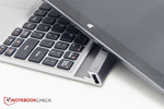 Die Verbindung zwischen dem Tablet und dem Tastaturdock, welches ebenfalls aus silbernem Plastik hergestellt ist, wird mit Magneten realisiert. Das Tastaturdock besitzt einen vollwertigen USB-2.0-Anschluss auf beiden Seiten und einen rückwärtigen Subwoofer. Ein zusätzlicher Akku im Dock ist leider nicht enthalten und auch nicht optional erhältlich. Die Verarbeitung ist ordentlich, allerdings haben wir bemerkt, dass die beiden Geräte nicht perfekt füreinander ausgerichtet sind, wenn das Tablet in das Dock gesteckt wird. Das Tablet ist ziemlich stabil, produziert aber Knarzgeräusche beim Verwinden, das Tastaturdock lässt sich unter Druck sehr leicht durchbiegen.