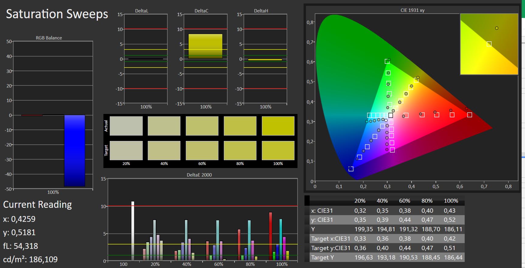 | Delta E Graustufen * | 5.63 | 10.1 -79% | 9.52 -69% | 2.18 61% | 3 47% | 6.95 -23% |