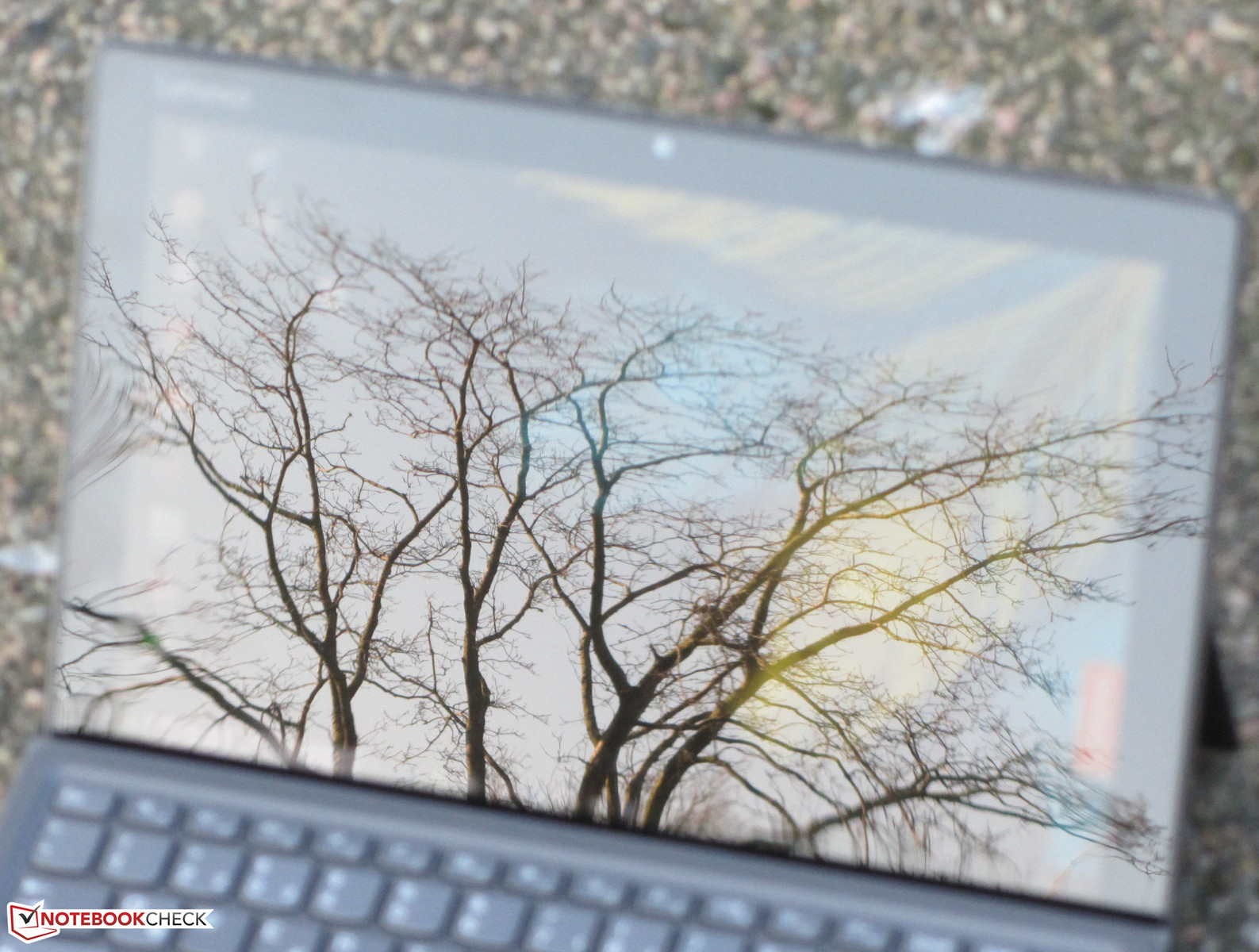 Lenovo stattet das Miix 520 mit einem blickwinkelstabilen IPS-Panel aus. Somit ist der Bildschirm aus jeder Position heraus ablesbar. Im Freien kann das Convertible benutzt werden, wenn die Sonne nicht allzu hell strahlt. Aber auch dann macht sich die spiegelnde Displayoberfläche negativ bemerkbar.