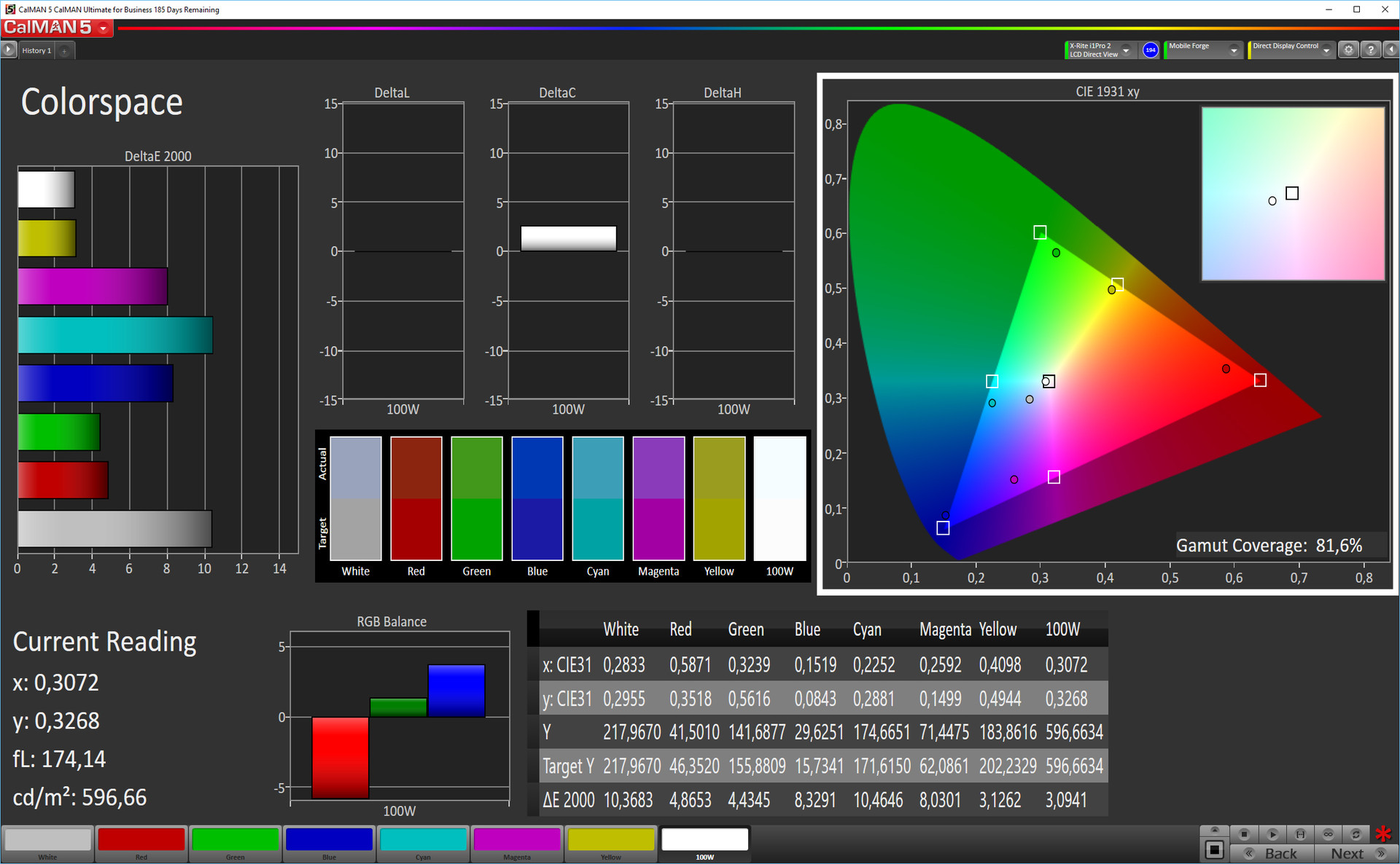 Eine genauere Analyse der Farbwiedergabe liefert uns die Software CalMan und ein Spektralfotometer. Hier zeigen sich erfreulich geringe Abweichungen vom Referenzfarbraum. Bei den Graustufen gibt es nur einen sehr leichten Blaustich, der mit bloßem Auge kaum zu erkennen ist.