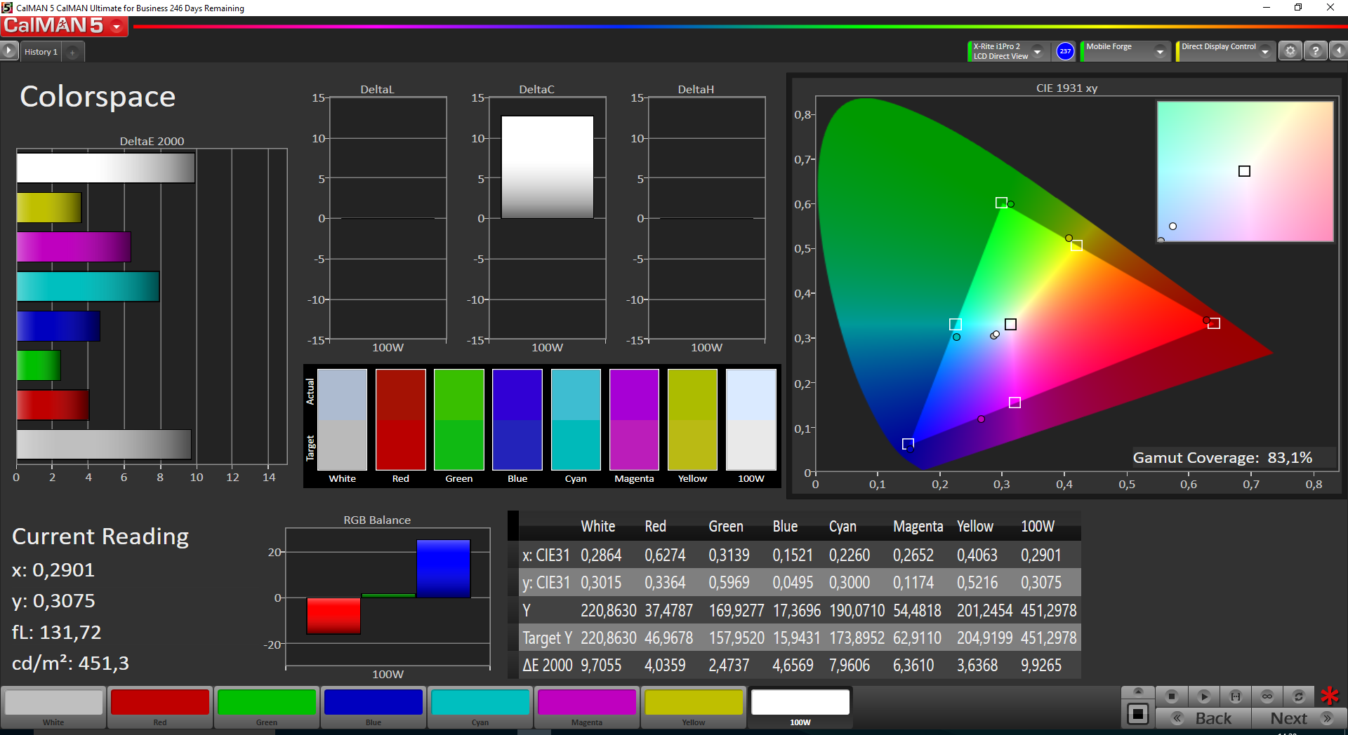 Die Farbanalyse mit Hilfe des X-Rite Spektralfotometers zeigt durchschnittliche Graustufen und eine leicht unausgeglichene RGB-Darstellung. Dies spiegelt sich auch in unseren Farbsättigungstests wider, bei denen manche Farben (zum Beispiel Gelb) mit steigender Sättigung akkurater werden, wohingegen dies für andere (wie zum Beispiel Grün) mit sinkender Sättigung eintritt. Ein leichter Blaustich ist sichtbar und die Farbraumabdeckung ist nicht optimal, zur Farbbewertung bei professioneller Anwendung oder auch nur bei den Urlaubsbildern sollte man den Bildschirm also nicht verwenden.