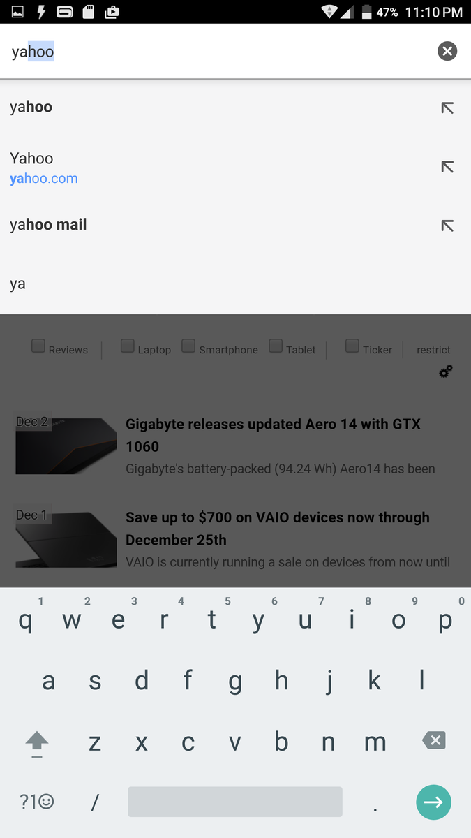 Der 10-Punkt-fähige kapazitive Bildschirm reagiert flott und zuverlässig auf Eingaben und hat auch an den Ecken und Kanten keine Probleme mit der Erkennung. Die Eingabeverzögerung ist minimal und der große Bildschirm hilft dabei, die Anzahl der Tippfehler gering zu halten. Die Kehrseite der Medaille ist das Querformat, das aufgrund der Größe des Smartphones die Benutzung mit kleinen Händen fast unmöglich macht, da man mit den Daumen nicht bis zur Bildschirmmitte kommt. Wortvorschläge und Swype-Gesten zur Eingabe beherrscht die Tastatur bereits von Haus aus.