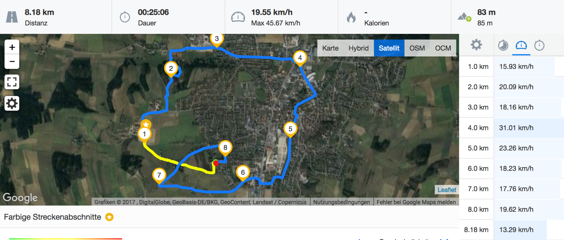 Das integrierte GPS-Modul scheint deutlich akkurater zu arbeiten als das des LG G3. TTFF is selbst ohne WLAN-Unterstützung sehr schnell und wir hatten keinerlei Schwierigkeiten bei der Navigation. Im Vergleich zu einem Garmin 500 GPS ist das Phab 2 Pro wie für ein Smartphone üblich in Kurven deutlich ungenauer. Zudem ist die Messung der Entfernung leicht abweichend: Auf 8 Kilometer misst das Lenovo Phab 2 Pro 300 Meter weniger Strecke. Die Genauigkeit der Wegführung ist aber noch OK und deutlich exakter als bei günstigeren Smartphones.