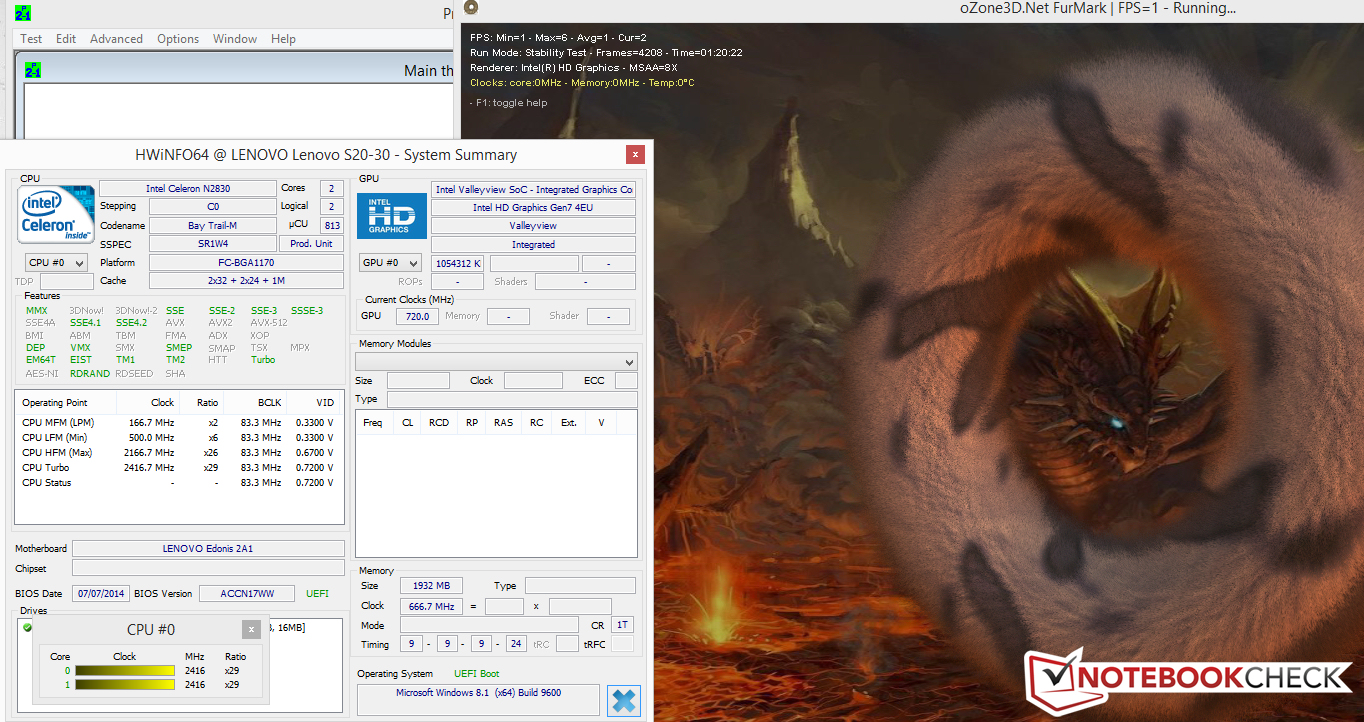 Der Prozessor des S20 ist uns in der letzten Zeit häufig begegnet. Der Celeron N2830 Zweikernprozessor (Bay Trail) steckt in vielen der seit einigen Wochen vermehrt auftauchenden Tiefstpreis-Notebooks. Die CPU arbeitet mit einer Basisgeschwindigkeit von 2,16 GHz. Per Turbo kann die Geschwindigkeit auf 2,416 GHz erhöht werden. Die CPU-Tests der Cinebench Benchmarks bearbeitet der Prozessor sowohl im Netz- als auch im Akkubetrieb mit voller Geschwindigkeit (2,416 GHz). Somit kann die volle Rechenleistung stets abgerufen werden.