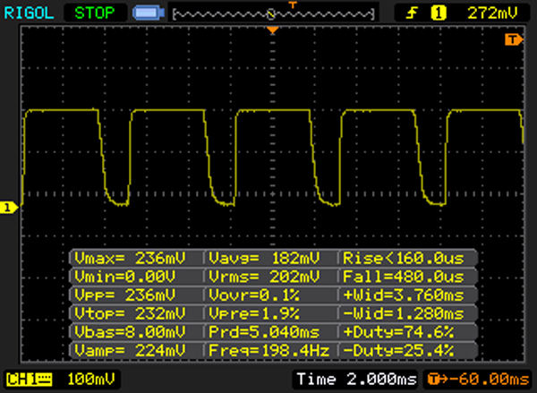 Das Display flackert mit 198 Hz (im schlimmsten Fall, eventuell durch Pulsweitenmodulation PWM) bei einer eingestellten Helligkeit von 90 % und darunter. Darüber sollte es zu keinem Flackern kommen. Die Frequenz von 198 Hz ist relativ gering und daher sollte es bei sensiblen Personen zu Problemen wie Flackern oder Augenbeschwerden führen. Im Vergleich: 53 % aller getesteten Geräte nutzten kein PWM um die Helligkeit zu reduzieren. Wenn PWM eingesetzt wurde, dann bei einer Frequenz von durchschnittlich 8118 (Minimum 5, Maximum 343500) Hz. | |||