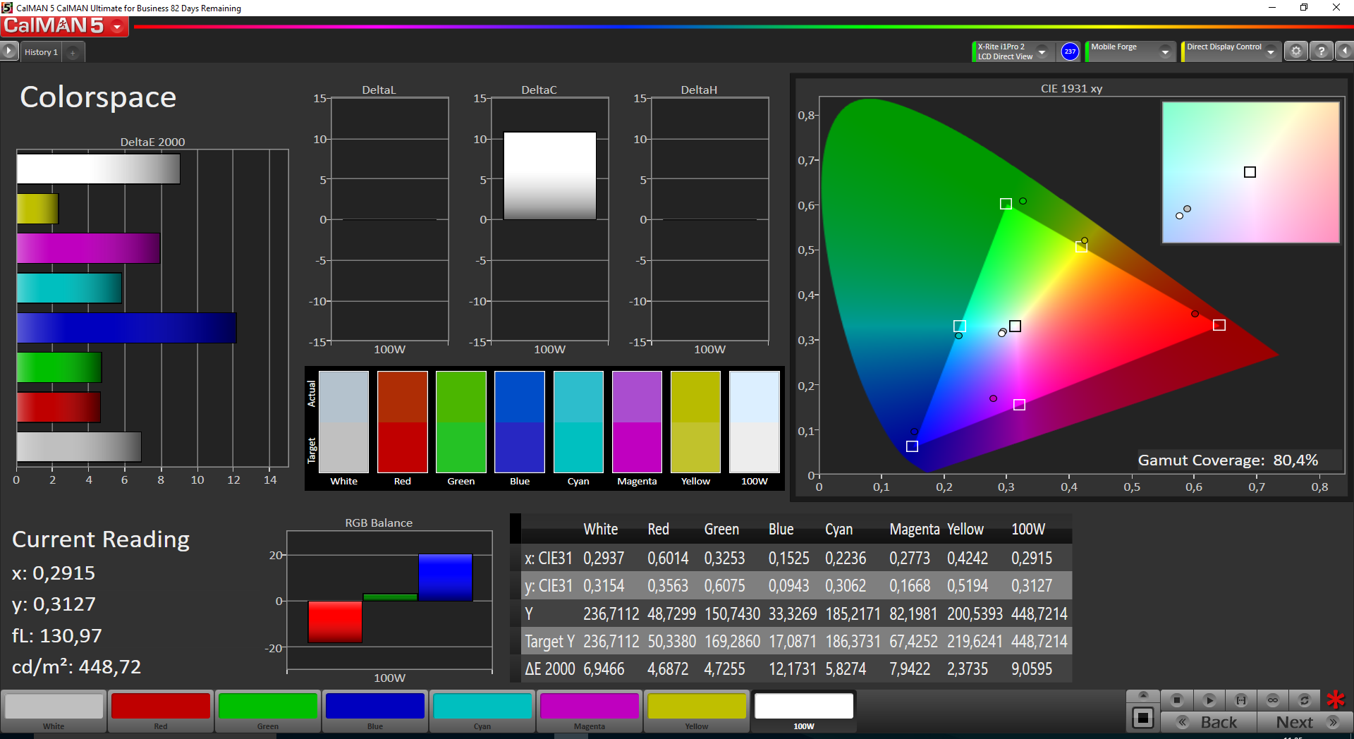 Ein deutlicher Blaustich wird bei unseren Tests mit dem Spektralfotometer und der Software CalMAN sichtbar. Abgesehen von Blau werden die Farbtöne aber recht exakt wiedergegeben. Die Farbraumabdeckung ist mit 80,4 % bei sRGB recht gering, sodass man das Display nicht für eine professionelle Farbbeurteilung nutzen sollte.