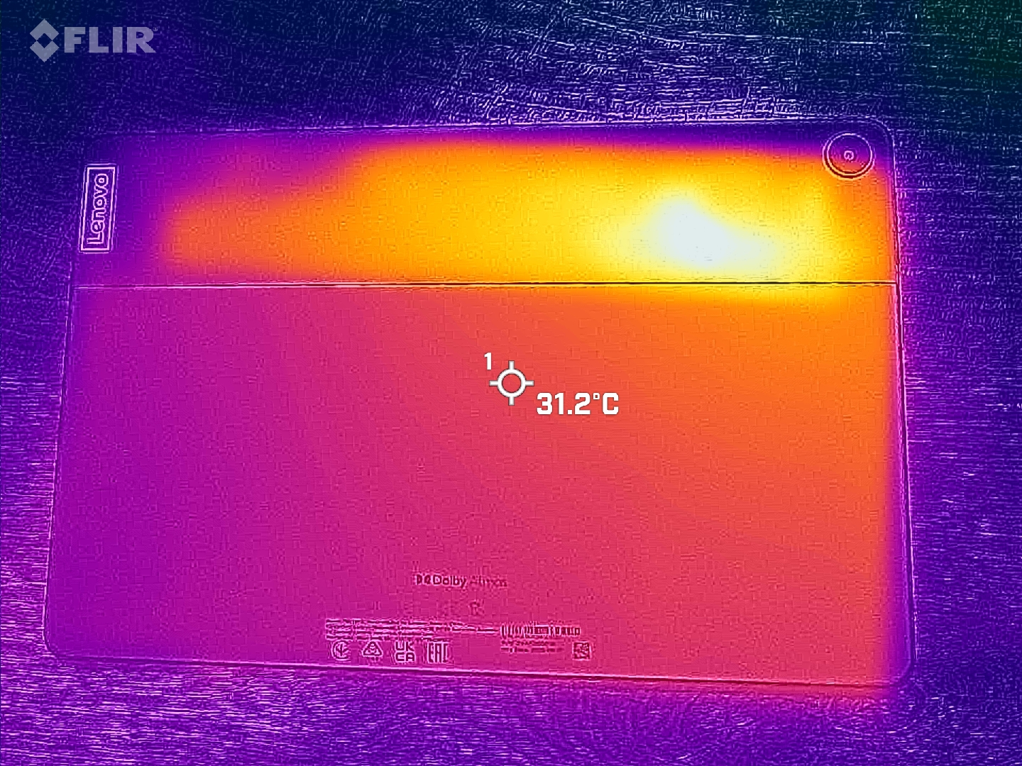 (-) Auf der Unterseite messen wir eine maximalen Wert von 48.2 °C (im Vergleich zum Durchschnitt von 33.2 °C).
