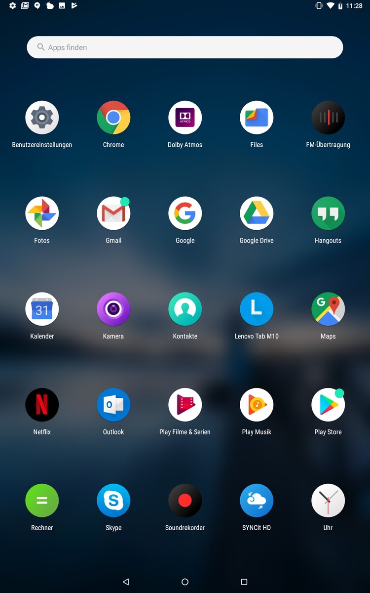Weil der Speicherplatz beim Tab M10 nicht allzu üppig bemessen ist, freut man sich über jedes eingesparte GB. Passenderweise hält sich Lenovo bei den Software-Beigaben angenehm zurück und gibt seinem Tablet nur wenige Zusatz-Apps mit auf den Weg, sieht man von Standard-Softwarebeigaben wie den Google- und Microsoft-Apps ab, darunter Chrome, Gmail, Skype und Outlook. Die Zusatz-Apps beschränken sich im Prinzip auf Netflix, FM Radio und das Backup-Tool Syncit HD. Deinstallieren lassen sich aber nicht alle, so zum Beispiel Netflix, dass man nur deaktivieren kann.