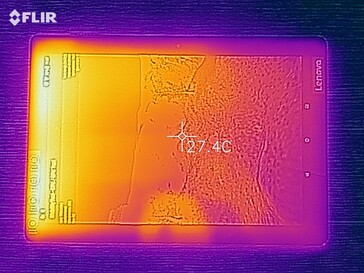 Das Lenovo Tab M10 behält in allen Situationen einen kühlen Kopf. Einmal, weil es im Idle-Zustand an Vorder- und Rückseite lediglich eine Temperatur von durchschnittlich 26,6 °C erreicht. Zum anderen, weil sich daran auch unter Last nicht viel ändert. Selbst nach einer Stunde Stresstest steigt die Durchschnittstemperatur an der Oberfläche gerade einmal um 0,7 °C auf 27,3 °C an – und wärmer als 31,8 °C wird es selbst an der heißesten Stelle nicht.