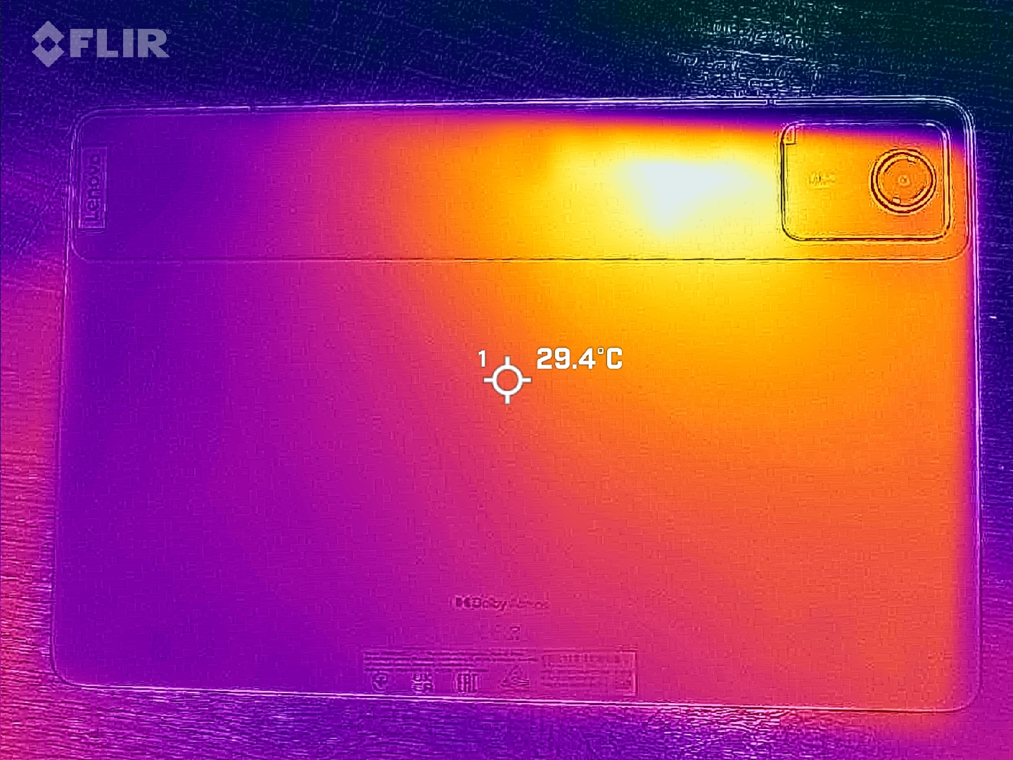Als maximale Temperatur messen wir 35,5 °C in der Spitze an der Vorderseite des Tab M11. Das ist zwar leicht spürbar, aber keineswegs problematisch. So bleibt auch noch Luft für wärmere Umgebungen, denn wir testen bei Zimmertemperatur. Das SoC drosselt auch unter längerer Last seine Leistung nicht.