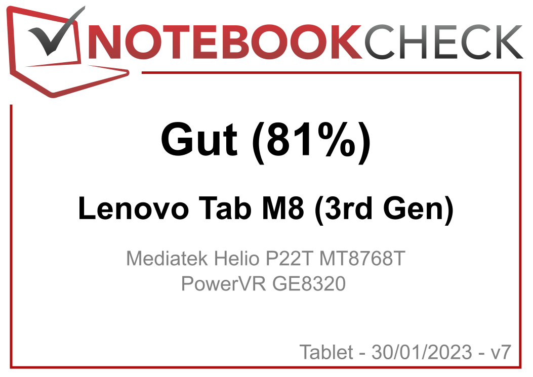 | 80.8 % v7 (old) | 01 / 2023 | Lenovo Tab M8 (3rd Gen) Helio P22T MT8768T, PowerVR GE8320 | 305 g | 8.15 mm | 8.00" | 1280x800 | |