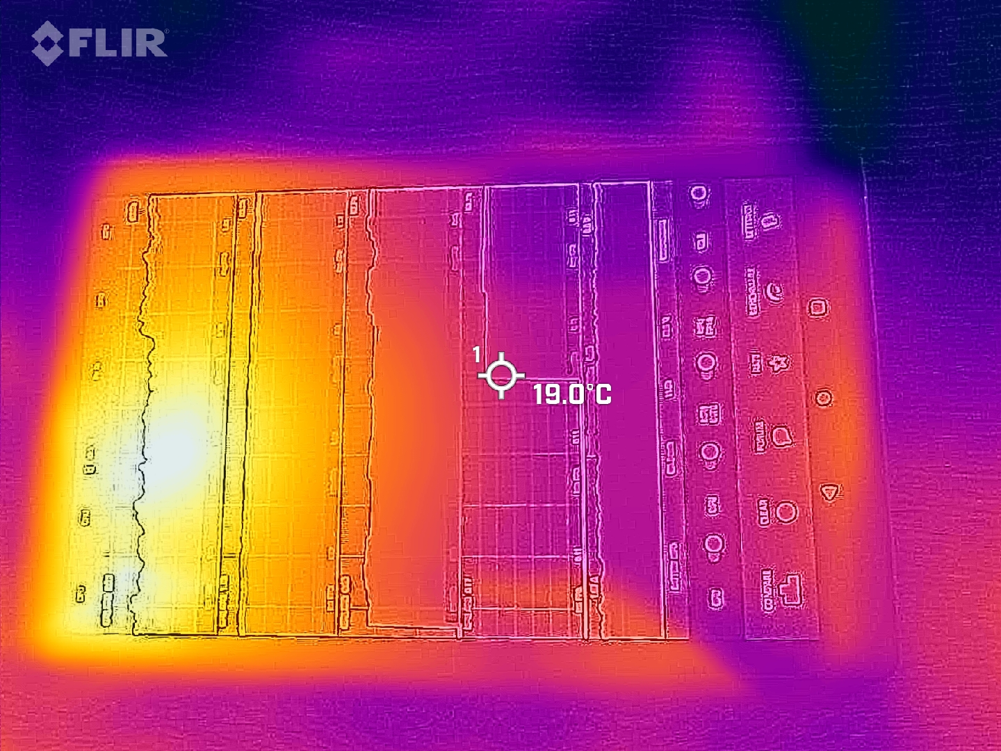 (+) Ohne Last messen wir eine durchschnittliche Temperatur von 21.1 °C auf der Oberseite. Der Klassendurchschnitt erreicht 30 °C.