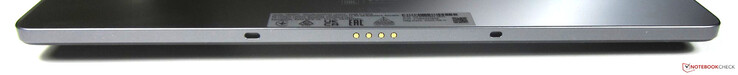 Der optionale Eingabestift Lenovo Precision Pen 3 haftet magnetisch an der Rückseite des Tab P11 Pro Gen 2 und wird dort gleichzeitig auch aufgeladen. Eine weitere magnetische Dockingstelle ist der Rahmen oberhalb der 8-MP-Selfiekamera. Die 4 Pogo-Pins an der Unterseite dienen zum Anschluss der optionalen Docking-Tastatur, die dort ebenfalls magnetisch einrastet.
