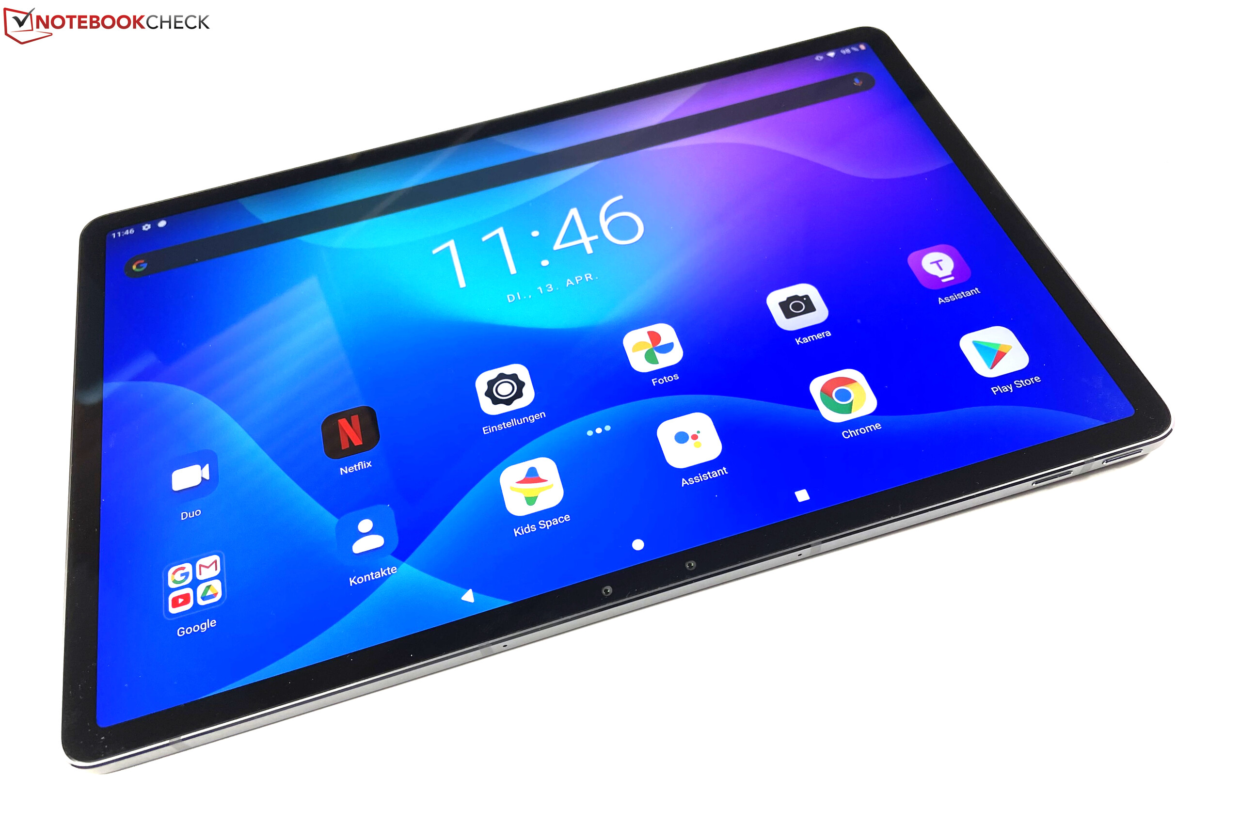 Im Display-Rahmen versteckt sich auch die 8-MP-Selfiekamera, die wie das 13-MP-Objektiv auf der Rückseite eine Dual-Kamera ist und das Tablet per 3D-Gesichtserkennung entsperren kann. Zur biometrischen Authentifizierung dient auch der Fingerabdrucksensor, der sich in der Powertaste verbirgt.