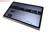 Des Rätsels Lösung der beiden unterschiedlichen Höhenmaße ist neben dem integrierten Soundsystem auch der ebenfalls eingebaute Kickstand. Der sitzt mittig am unteren Backcover, lässt sich an seinen mechanischen Scharnieren um fast 180 Grad ausklappen und hält die eingestellte Position fest ein. Dadurch kann man das Lenovo-Tablet sehr flexibel aufstellen, was aber nur im Querformat wirklich gut funktioniert. Im 90-Grad-Aufstellwinkel geht es zur Not auch im Hochformat, ist dann aber eine sehr wackelige Angelegenheit.