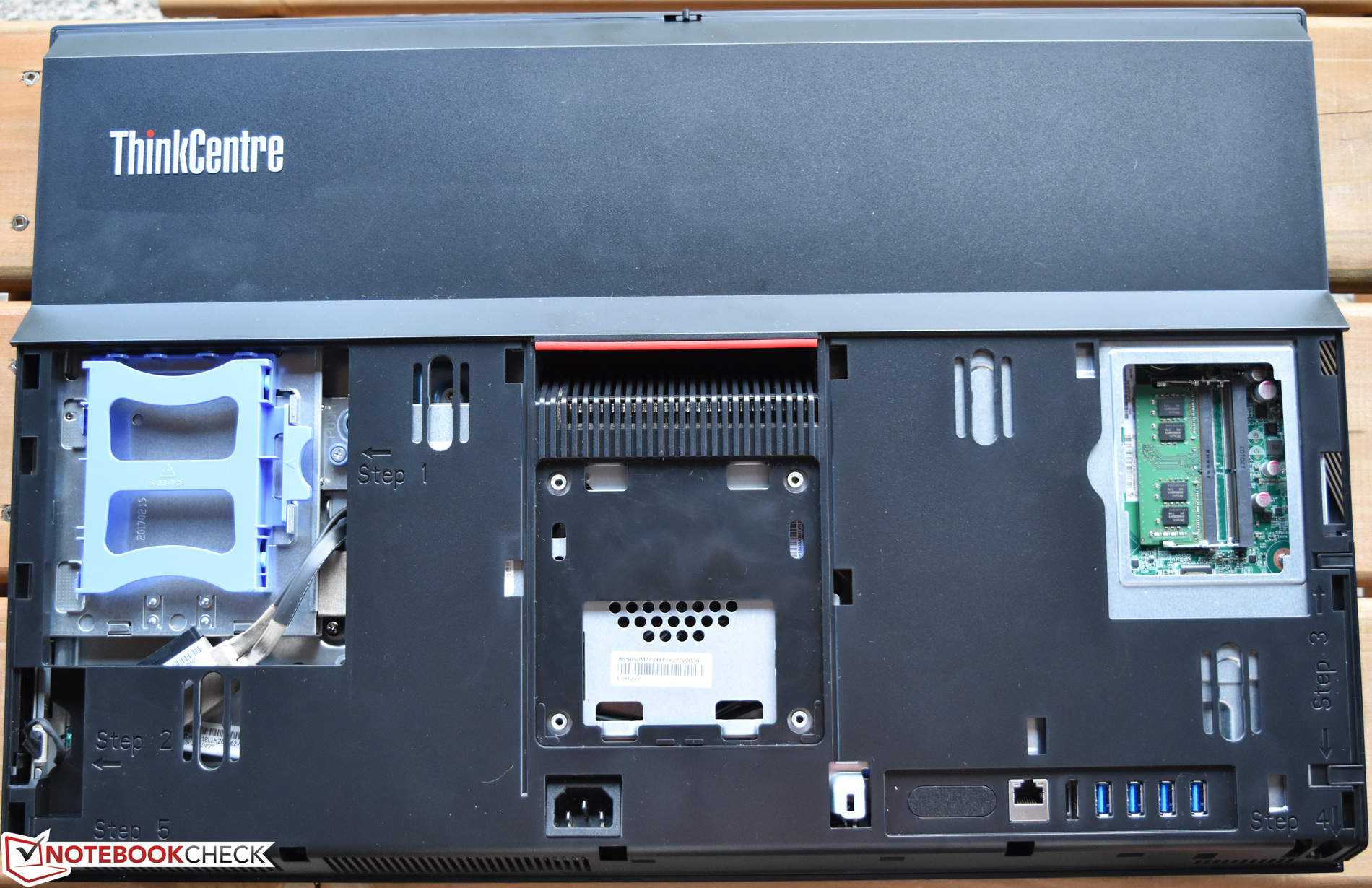 Die Wartung ist für ein All-in-One-Gerät relativ einfach. Einer der größten Kritikpunkte an AIO-Desktops ist traditionell die Erreichbarkeit des Innenlebens. Doch zumindest Zugriff auf Festplatte und RAM gestalten sich beim M910z einfach: Gerät umdrehen, Riegel nach oben schieben und den Fuß von der Rückseite entfernen, Rückseite zum Entfernen nach unten drücken und schieben. Darunter finden sich beide Festplattenschächte und das RAM. Bei unserem Gerät war eine NVMe-SSD in einem schwächeren PCIe-M.2-Slot installiert. Der Festplattenschacht war leer und erwartet auf Wunsch ein Laufwerk.