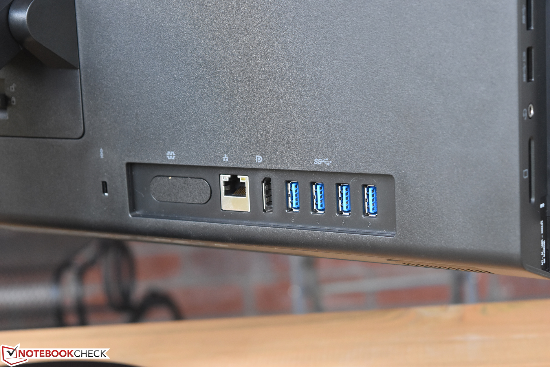 Zwei USB-3.1-Gen-1-Ports (einer davon: Always On + Fast Charge), der Kartenleser und eine Kopfhörer/Mikrofon-Audio-Kombibuchse befinden sich an der linken Seite des Gerätes und sind dort leicht erreichbar. Die übrigen vier USB-3.1-Ports (insgesamt 6), der DisplayPort und der Gigabit-Ethernet-Port befinden sich an der Rückseite. Der Stromanschluss liegt ebenso im zentralen Bereich der Rückseite. Kabel können durch einen, an der linken Seite des rückwärtigen Scharniers befestigten, Ordnungsring geführt werden, sodass es hinter dem Gerät am Schreibtisch des Users aufgeräumt aussieht.