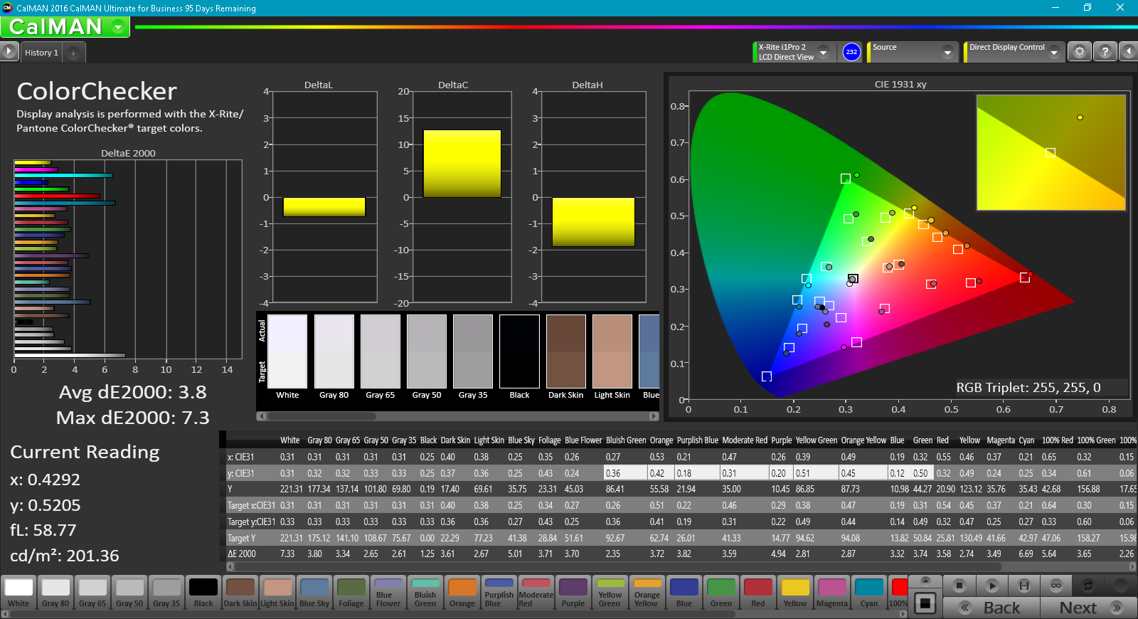 CalMAN liefert vorwiegend positive Ergebnisse. Die ColorChecker und Greyscale DeltaE Durchschnittswerte betragen 3,8 bzw. 3,7. Der Gesamt-Gamma beläuft sich auf 2,38 und der CCT-Durchschnitt auf 6701. Die letzeren Beiden sind fast ideal und übertreffen die beiden Konkurrenten in unserer Vergleichsgruppe.